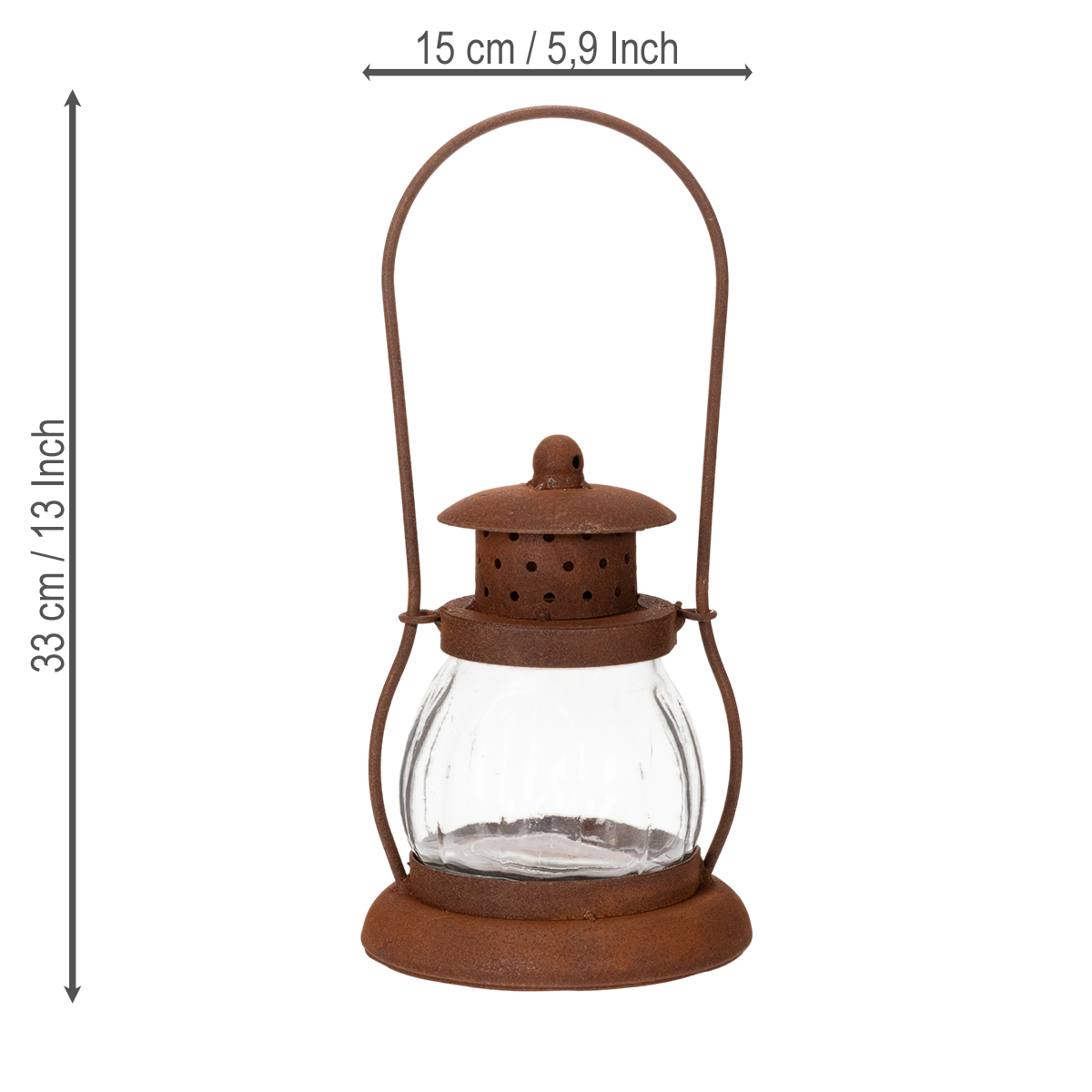 Diese antike Gartenlaterne ist ein wahres Schmuckstück für jede Inneneinrichtung oder Outdoor-Dekoration. Mit ihrer Höhe von 33 cm und einem Durchmesser von 15 cm hat sie eine angenehme Größe, die auf keinem Fest oder im Garten unauffällig bleibt. Das braune Metall bildet mit dem klaren Glas einen charmanten Kontrast – ein Design, das Erinnerungen an vergangene Tage weckt, aber dennoch zeitgemäß bleibt.