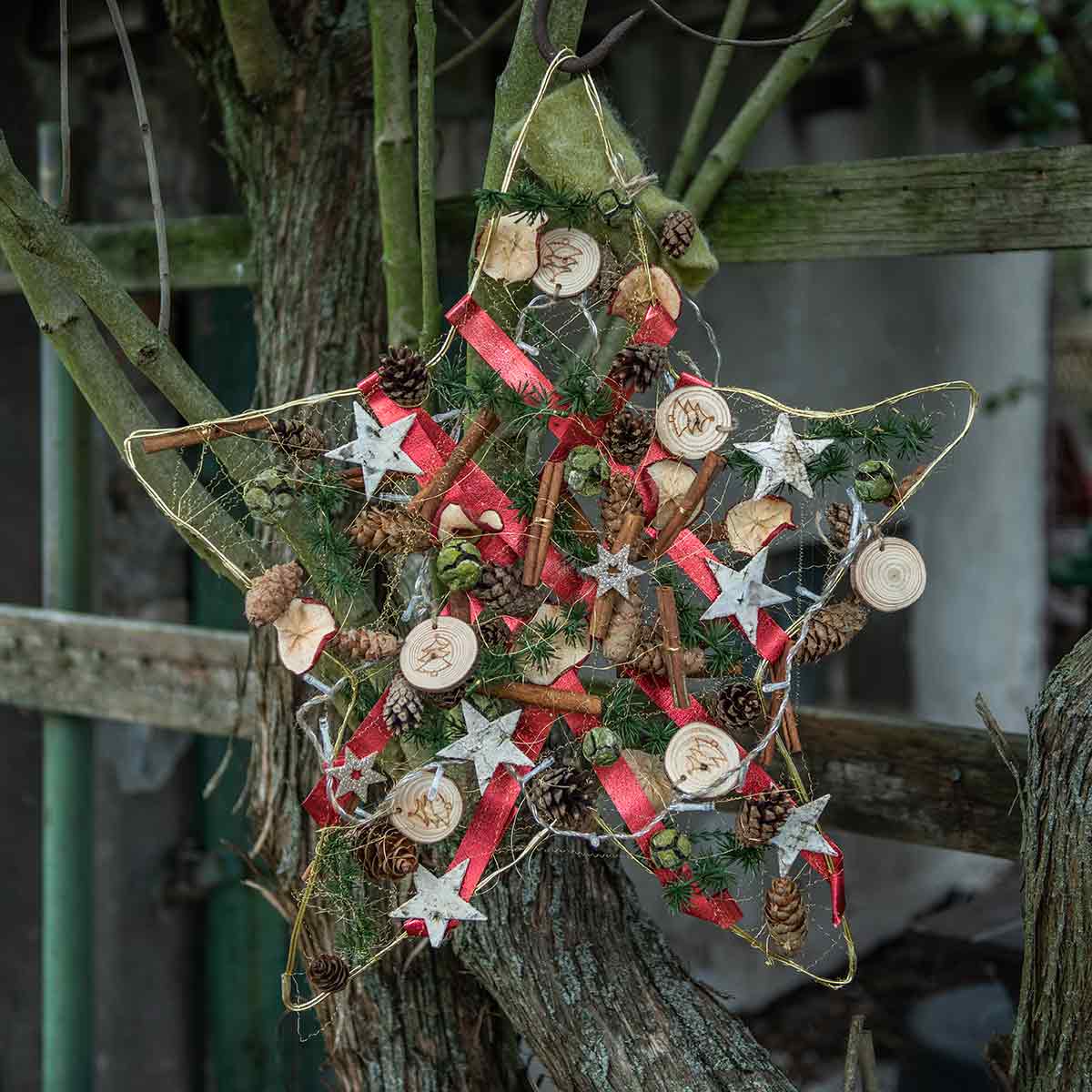 Die Lichterkette ist zusätzlich mit einer Jutekordel verbunden. Daran sind Holzscheibchen befestigt, die wie Miniatur-Baumscheiben aussehen und mit einem Schneeflockenmotiv versehen sind. Die Innenlichterkette spendet nicht nur Licht, sondern ist gleichzeitig auch eine Girlande mit schmucken Holzanhängern.