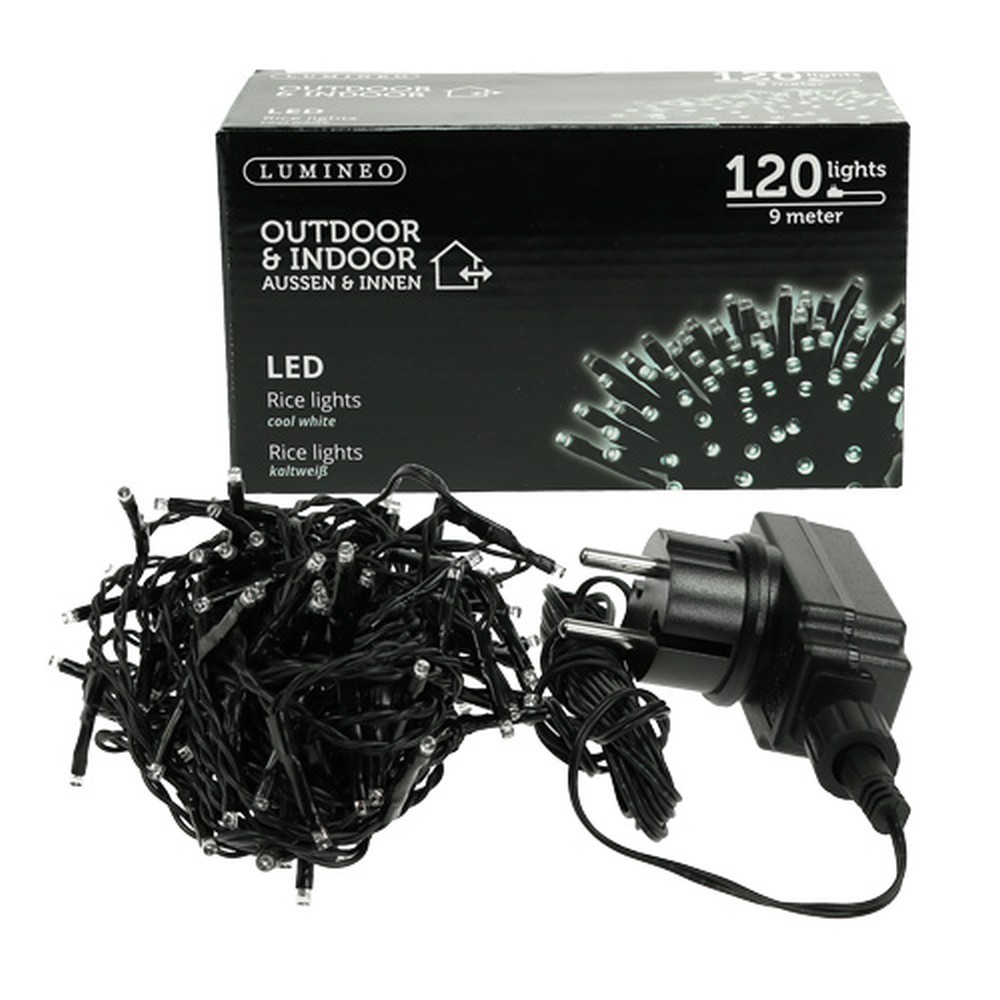 Stai ancora cercando una catena leggera robusta e resistente alle intemperie per la tua festa? Quindi hai trovato questa catena di riso a LED lunga 9 metri. Il nobile bianco freddo sul cavo nero genera abbastanza luce per illuminare percorsi o decorazioni da giardino senza essere invadente. Puoi anche illuminare alberi, piante o la cantina della tua festa con questa ghirlanda. In occasione di eventi di alto livello come una cena, un concerto o un anniversario aziendale, l'elegante luce della catena ispira tanto quanto un barbecue rilassato.I 120 LED sono montati su una catena nera con una lunghezza di 9 metri. La catena di lampade per feste può essere fissata in modo flessibile al muro, alle piante o ai recinti del giardino. Prova anche a decorare il tuo albero di Natale con le lucine a risparmio energetico. Un grande effetto di illuminazione ti aspetta!