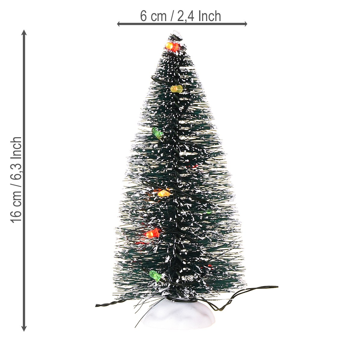 Die zehn LED-Lämpchen in jedem Mini-Tannenbaum strahlen bunt und stimmungsvoll. Der künstliche Weihnachtsbaum ist beschneit, wobei aber auch das tiefe Grün noch schön zur Geltung kommt. Das Bäumchen steht selbstständig auf einem kleinen Kunststoffsockel.