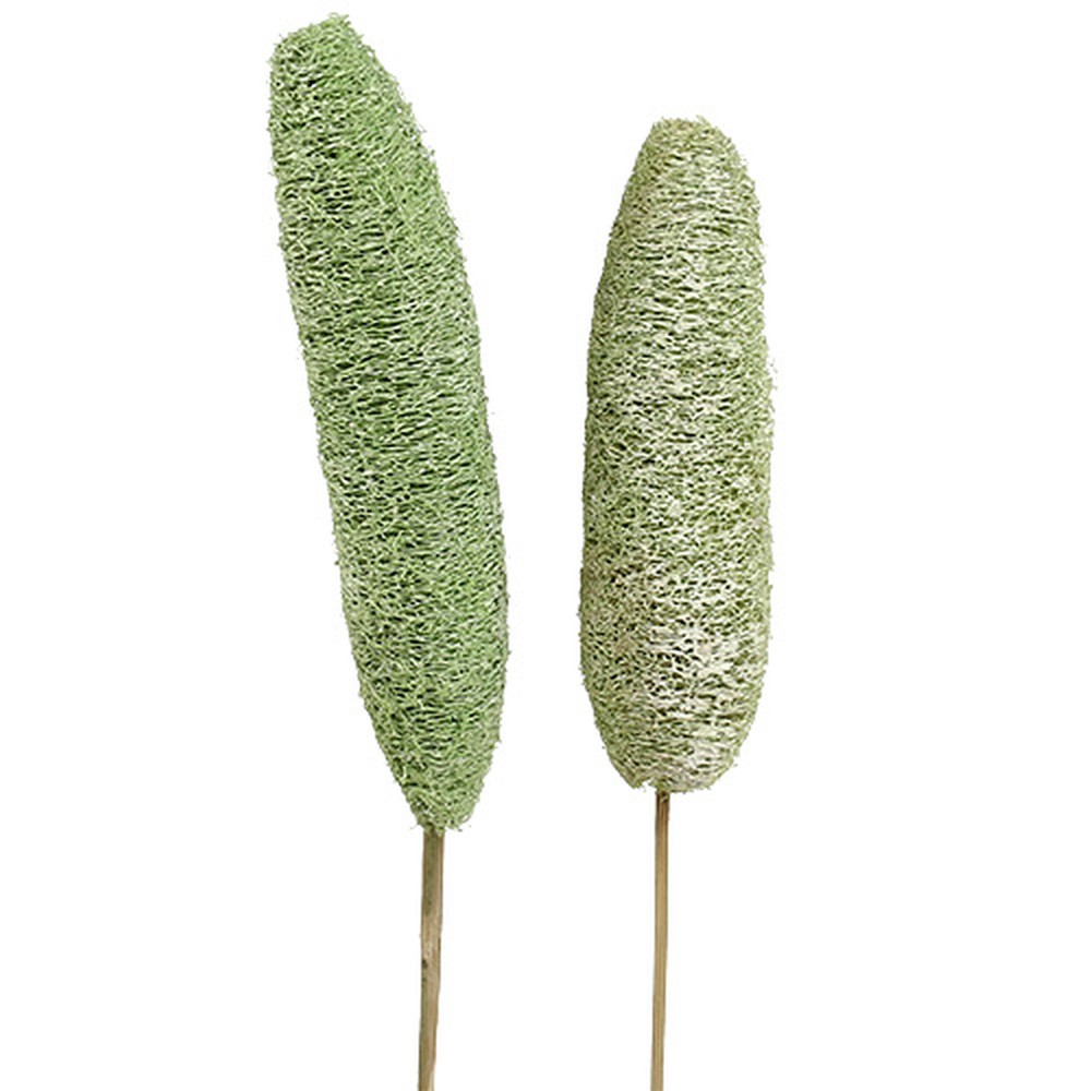Ce grand luffa teinté en vert et fixé sur une tige en bois naturelle représente la partie intérieure et fibreuse de la courge éponge (Luffa aegyptiaca ou Luffa cylindrica). Il appartient donc à la famille des Cucurbitaceae et une fois séché, il forme un article de décoration très apprécié que l’on retrouve dans bon nombre de compositions et de décorations. Son allure résolument exotique en fait le point de mire de nombreux arrangements et couronnes et combinés à d’autres matériaux exotiques sur tige, il vous permettra de réaliser de sublimes bouquets pour votre intérieur ou pour un commerce.Avec leur tiges qui par ailleurs peuvent être écourtées, vous n’aurez aucune difficulté à glisser les éponges végétales dans de la terre, du polystyrène ou de la mousse florale sèche. Elles donneront beaucoup de cachet aux compositions funéraires et combinées à des proteas, des cônes, des rubans, des branches de sapin et de la mousse d’Islande, elles vous permettront d’élaborer de somptueux arrangements de deuil et de sublimes couronnes mortuaires que vous déposerez sur la tombe d’un proche pour la Toussaint ou d’autres fêtes importantes. Avec sa couleur verte très rafraîchissante, le luffa pourra également être placé dans un vase en verre ou en céramique qui garnira votre vitrine à l’arrivée du printemps. Pour l’accompagner, vous pourrez sélectionner d’autres plantes séchées comme des Palmspear, des Palm Cup ou des lys sauvages. Et n’oubliez pas que l’éponge de luffa peut également agrémenter un bouquet de fleurs fraîches !