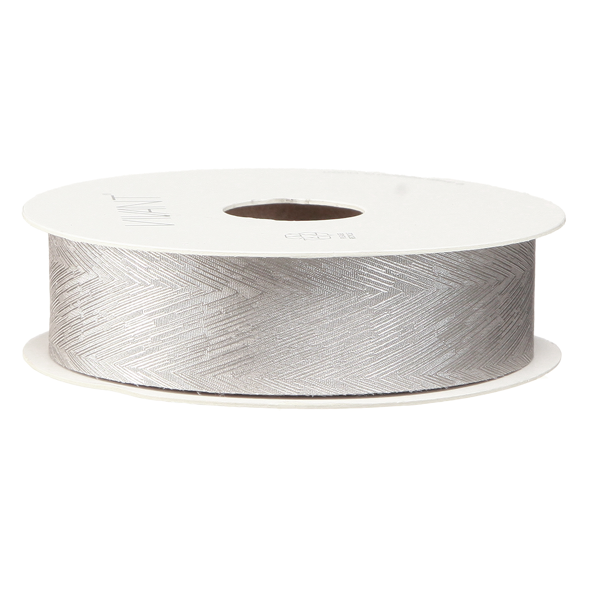 Lussuoso nastro di seta argentata con elegante disegno di piume, ideale per matrimoni e occasioni festive. Larghezza 25 mm, lunghezza 15 m