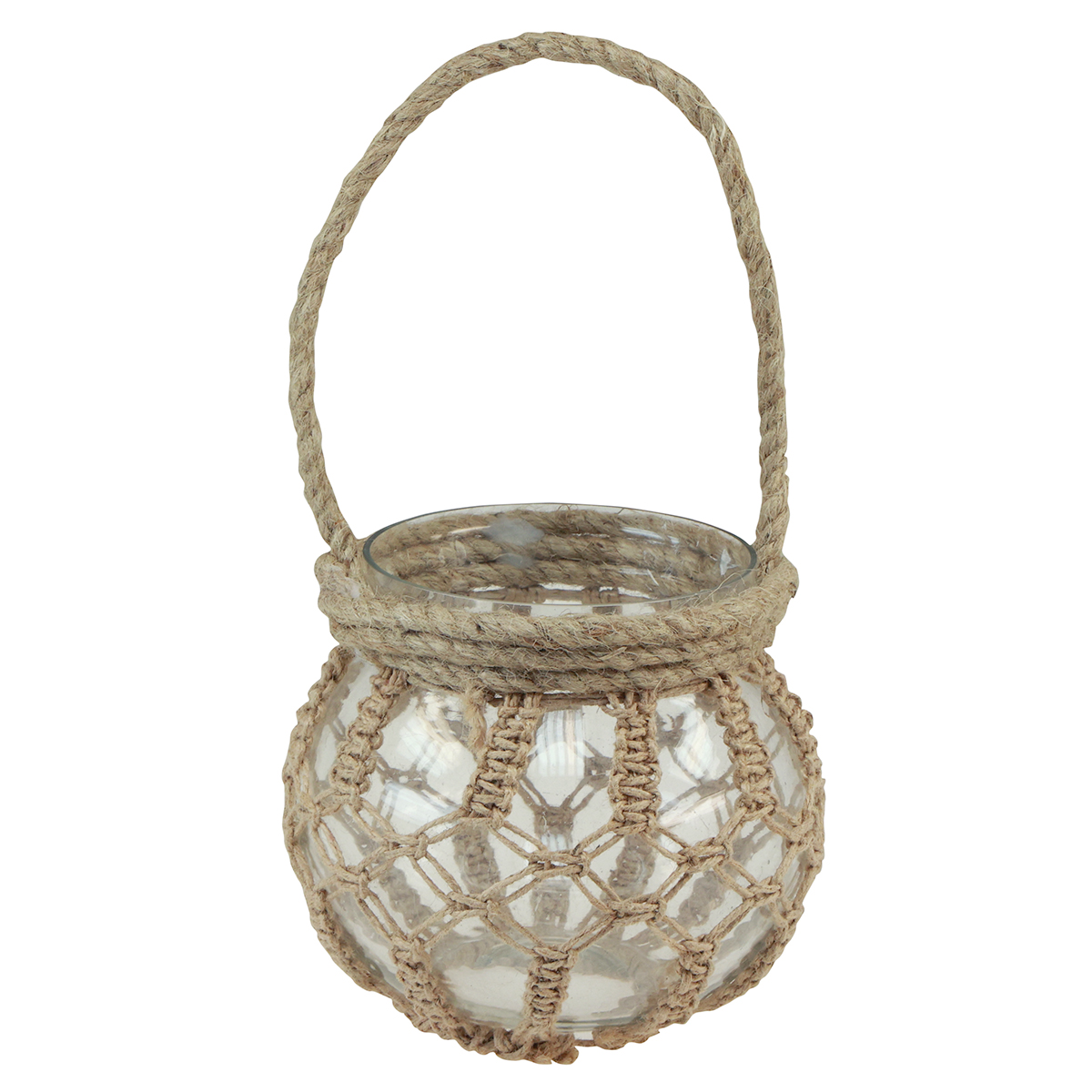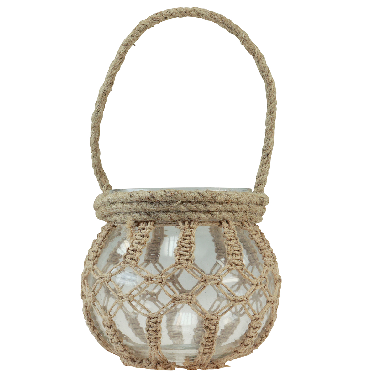 La bellissima decorazione rotonda in vetro è diventata un'elegante decorazione da appendere grazie al macramè. Il macramè di iuta dai colori naturali conferisce al vaso rotondo in vetro un tocco rustico.L'interno del vetro è chiaramente visibile attraverso la rete. Ed è qui che entra in gioco la tua creatività!