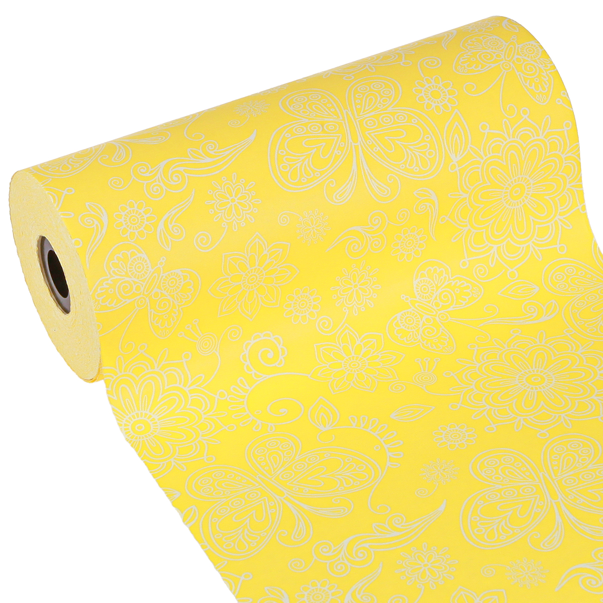 Das gemusterte Manschettenpapier in Gelb mit weißem Muster und weißer Innenseite befindet sich auf einer stabilen Spule, die auf einem Abroller befestigt werden kann. So haben Sie das Papier mit einer Breite von circa 25 Zentimetern und einer Gesamtlänge von ungefähr 100 Metern stets griffbereit und können unkompliziert verpacken!