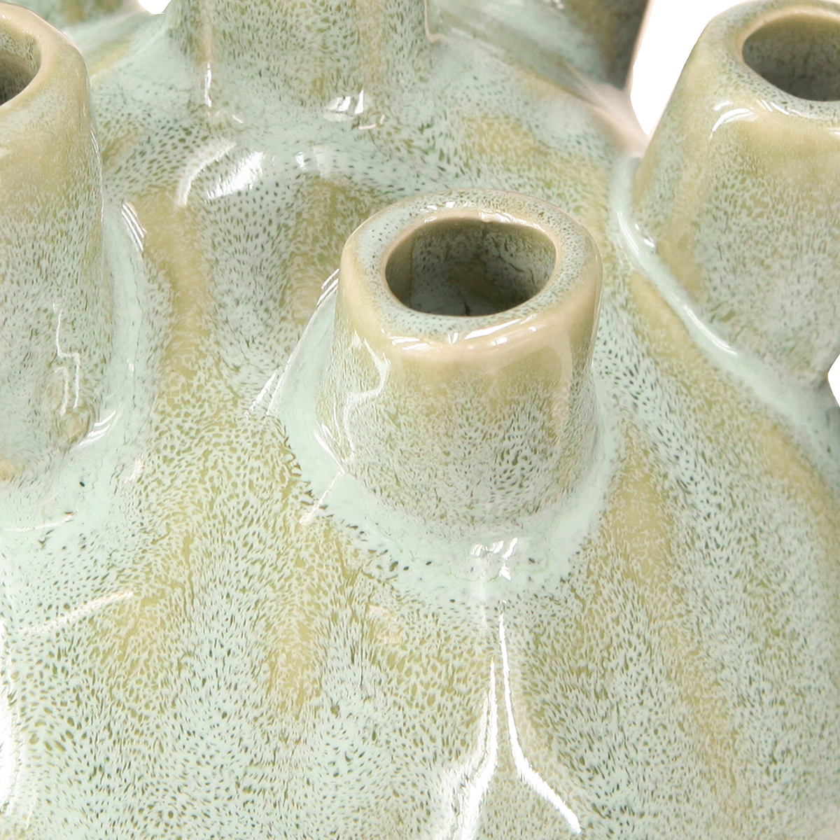 Die maritime Deko-Vase, die an Korallen erinnert, ist hellgrün glasiert und das perfekte Accessoire, um Ihrem Zuhause einen frischen und modernen Sommer-Look zu verleihen. Mit einem Durchmesser von etwa 11,5 cm und einer Höhe von ungefähr 10 cm fügt sich diese Keramik-Vase harmonisch in unterschiedliche Wohnstile ein, besonders in einem skandinavisch inspirierten Ambiente. Die hellgrüne Farbe dieser Vase im Korallen-Design erinnert an sanfte Meereswellen und bringt Ruhe in jeden Raum. Gefertigt aus hochwertiger Keramik, beeindruckt die Vase mit ihrer schimmernden Glasur, die jedem Lichteinfall sanft reflektiert. Dank der fünf Öffnungen eignet sich die Vase ideal für kreative Trockenblumen-Arrangements. Die robusten Kunststoffschoner an den Füßen schützen Ihre Möbeloberflächen. Da die Vase nicht zu 100% wasserdicht ist, eignet sie sich bevorzugt für Trockendeko, Zweige oder auch Kunstblumen.
