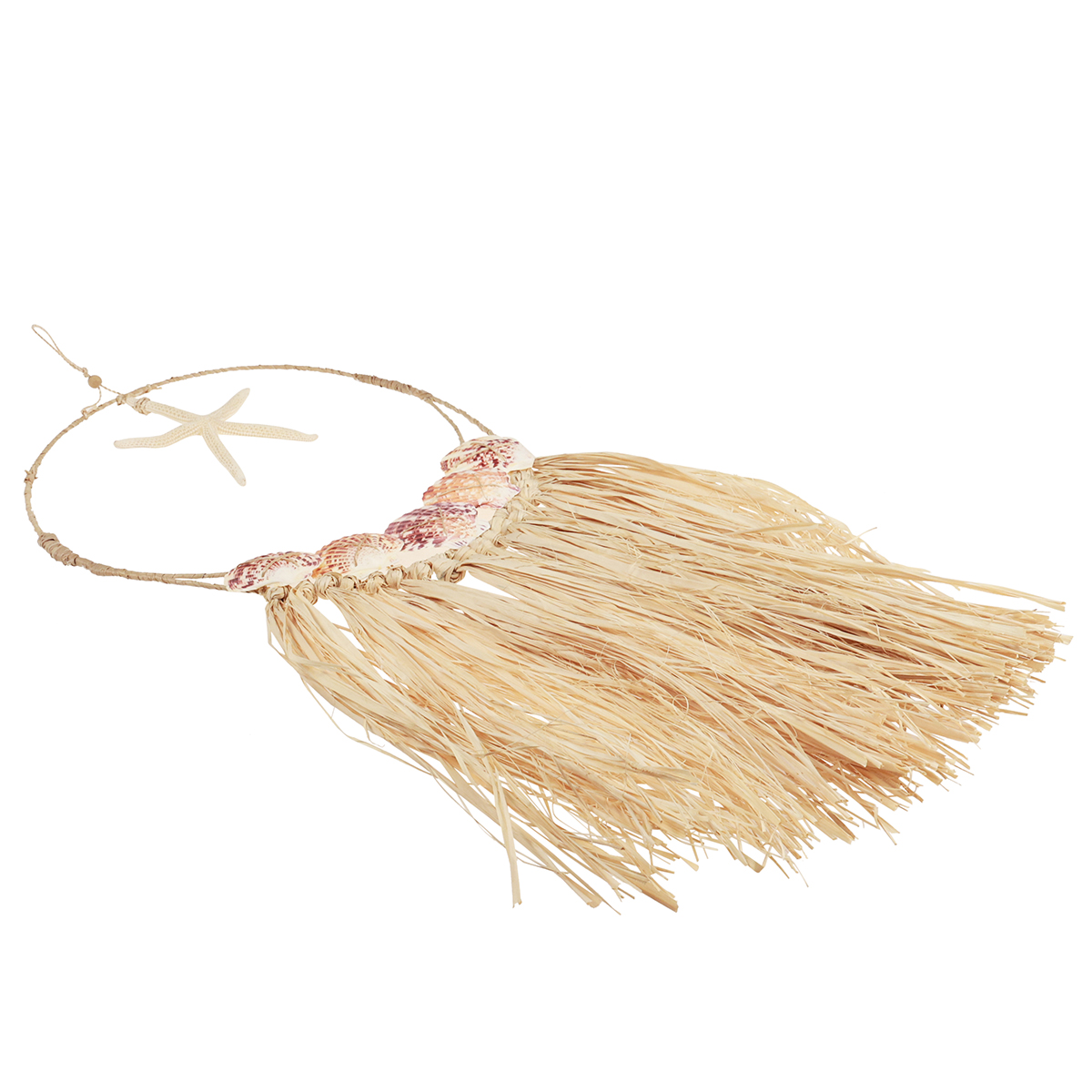 Matériel: raphia, métal, vrais coquillages, vraies étoiles de mer