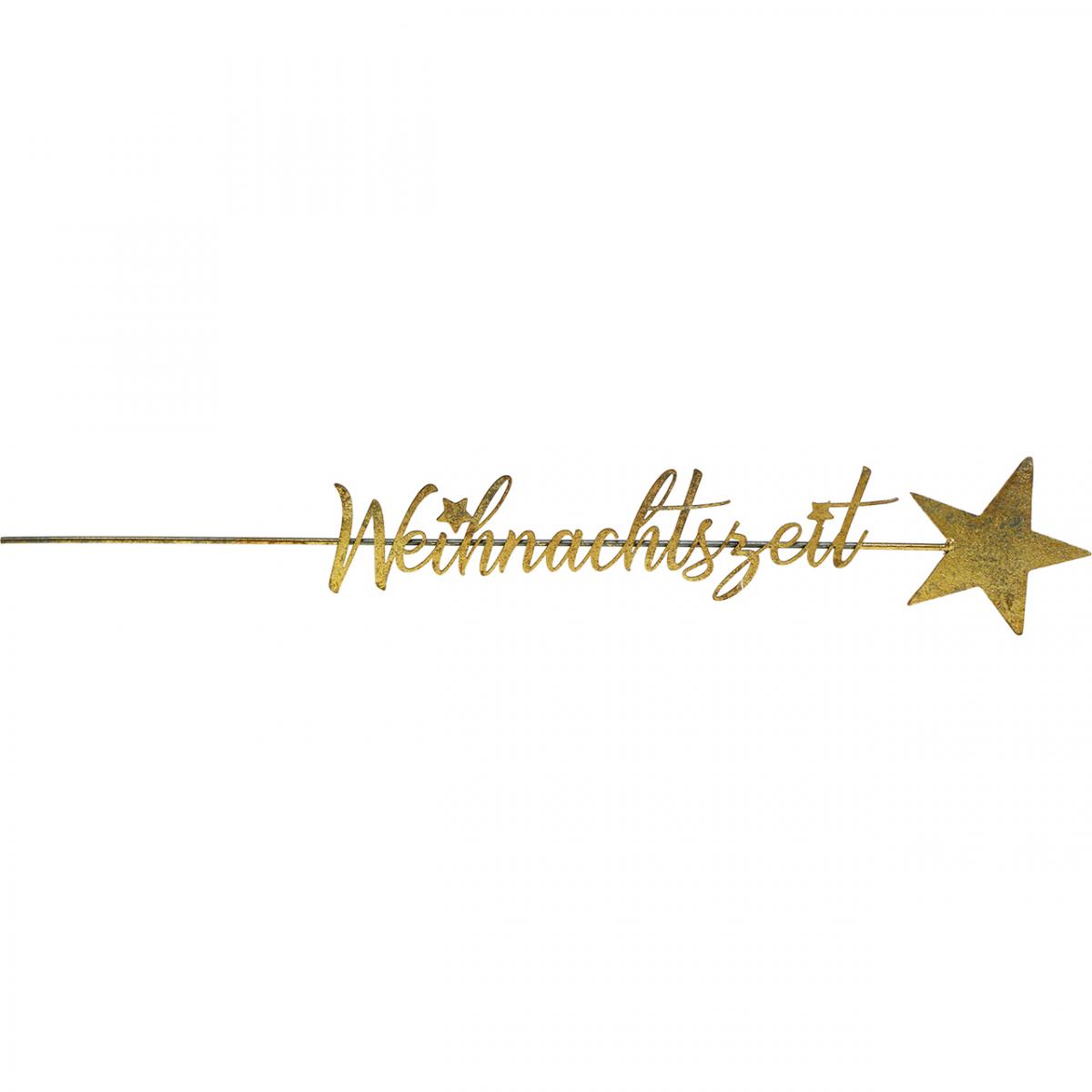 Der Metallstecker mit Schriftzug “Weihnachtszeit” kommt in Golden daher und lässt stellenweise das Grau des Untergrundes durchscheinen, was dem Blumenstecker eine rustikale Antik-Optik verleiht. Ein großer Goldstern an der Spitze und zwei kleine Sterne als I-Tüpfelchen vervollkommnen den Weihnachtsstecker für den Advent.
