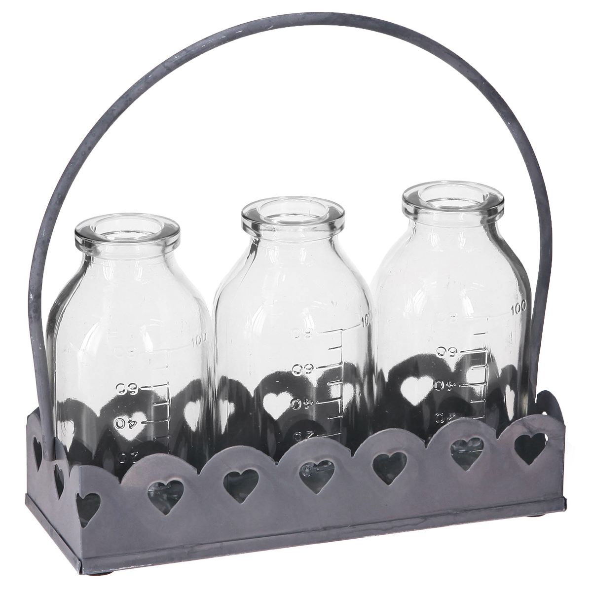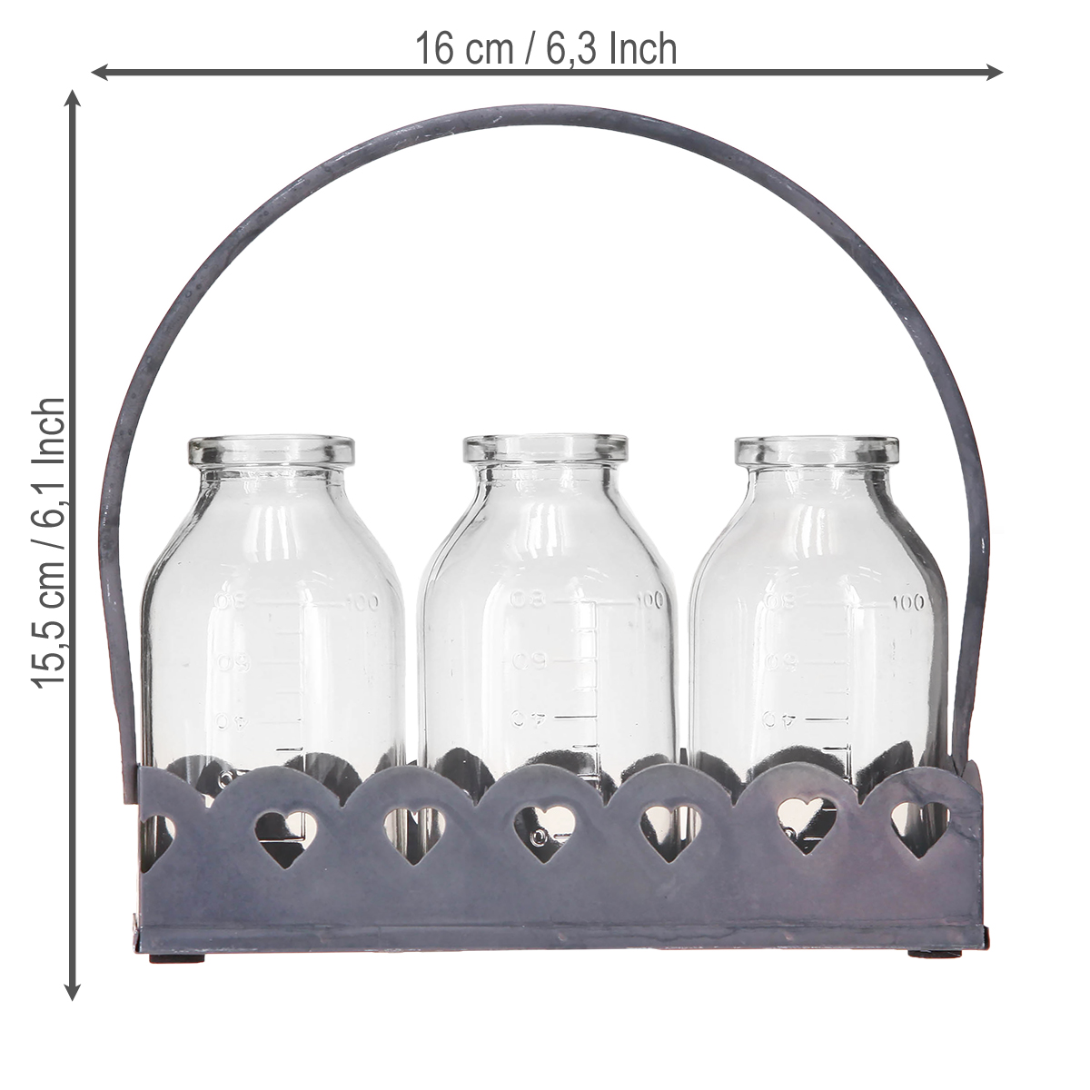 Scoprite il fascino magico delle decorazioni in mini bottiglie, disposte a forma di vaso su un vassoio. Queste graziose bottiglie decorative sono perfette per aggiungere un tocco di nostalgia al tuo spazio abitativo. Ognuno dei tre vasi in vetro ricorda le antiche bottiglie da farmacia ed è posizionato su un robusto vassoio di metallo grigio con motivi a forma di cuore traforati. Questo dettaglio in stile retrò aggiunge un tocco romantico alla composizione, rendendola ideale per decorazioni nuziali, accoglienti decorazioni da tavola o come idea regalo. Le dimensioni delle bottiglie ne consentono un utilizzo versatile, dalla rapida semina di piccole composizioni floreali alla conservazione di erbe aromatiche o materiali per l'artigianato.