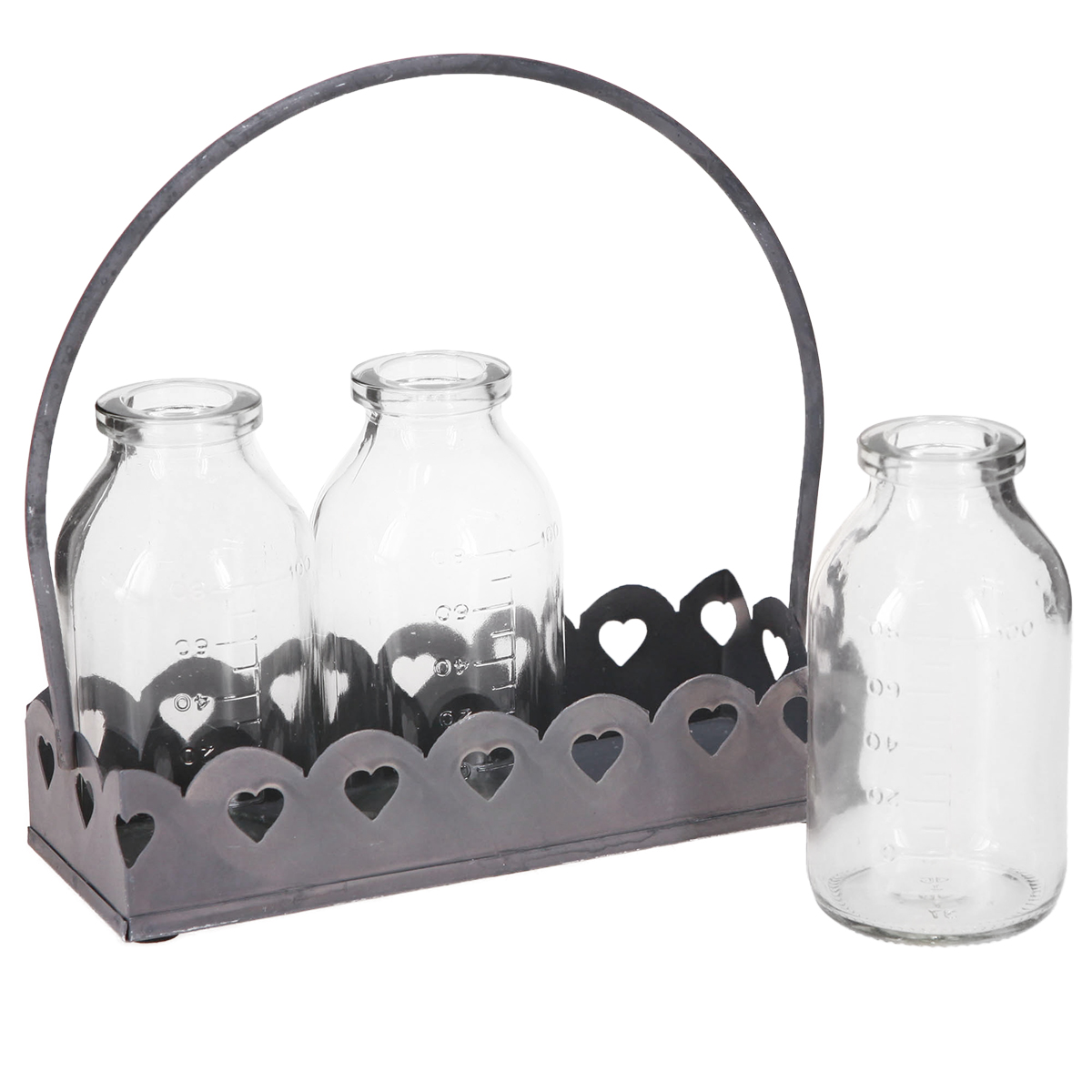 Découvrez l'attrait magique des décorations de mini bouteilles comme des vases sur un plateau. Ces charmantes bouteilles décoratives sont parfaites pour ajouter une touche de nostalgie à votre espace de vie. Chacun des trois vases en verre rappelle les flacons d'apothicaire anciens et est placé sur un plateau en métal gris robuste avec des motifs de cœur perforés. Ce détail de style rétro ajoute une touche romantique à l'arrangement, le rendant idéal pour les décorations de mariage, les décorations de table chaleureuses ou comme idée cadeau. Les dimensions des bouteilles ouvrent une variété d'utilisations, de la plantation rapide de petites compositions florales au stockage d'herbes ou de matériaux d'artisanat.