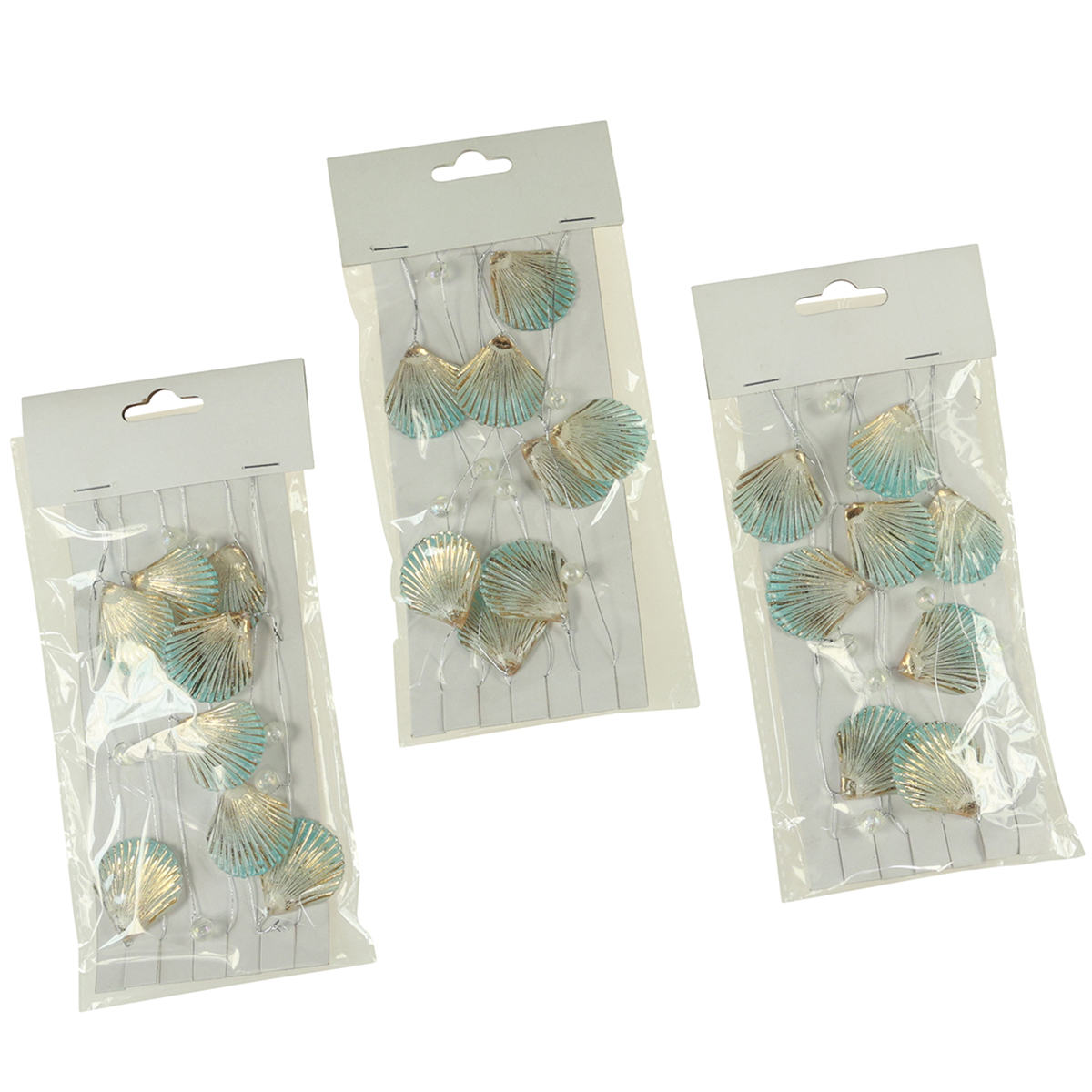 Sie erhalten die Muschelgirlande mit türkis-goldfarbenen künstlichen Muscheln mit Perlen zu 3 Stück in einer Packung.