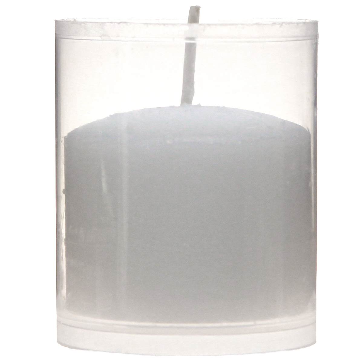La candela di ricarica in cera bianca e plastica è in un set di 20 pezzi ed ha un diametro di circa 5 centimetri in circa 5,8 centimetri di altezza. I manicotti di plastica sono riempiti ciascuno di cera a circa 4,5 centimetri e il tempo di combustione è di circa 18 ore.