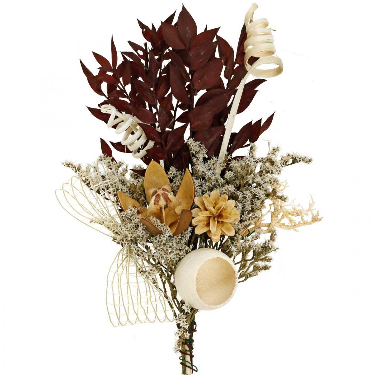 Matériel: branches de ruscus, achillea séché, plumosum, bobine de canne, cône de canne, vrille dorée, lis sauvage, pommes de pin de montagne, chardon de carte, lance de palmier, roses en mousse