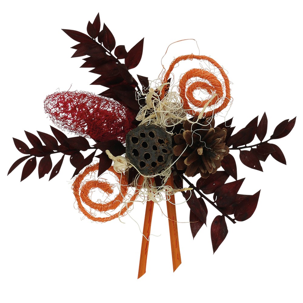 Materiale: ramoscelli di Ruscus, Achillea essiccato, fiasco di loto, primavera di canna, pigne di montagna, Plumosum, Palmspear, Luffa