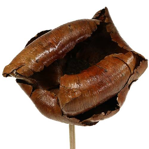 Diese exotische Natur-Blüte, Palm Cup, die an einem hölzernen Stiel angebracht ist, eignet sich für ausgefallene Dekorationen, wird aber auch vielfach in der Trauer- beziehungsweise Gedenkfloristik eingesetzt. Dazu lässt sich die Palmenblüte, deren bräunlich-naturfarbene Oberfläche sanft schimmert, beispielsweise mithilfe des Holzstabs in Steckschaum, Stroh, Styropor und Erde befestigen und mit anderen Trockenpflanzen sowie Grabkerzen kombinieren.Oder Sie stellen die Exoten zusammen mit anderen, an Stäben angebrachten Blüten in eine Vase und sorgen so für ein ruhiges, uriges Ambiente im Wohnzimmer. Ebenso lässt sich die Naturdeko im Herbst und zu Weihnachten verbasteln, indem Sie die Blüten beispielsweise von den Holzstielen lösen und mithilfe einer Angelsehne eine Girlande herstellen oder einen Wandkranz über und über damit besetzen. An einem Adventskranz ergibt sich mit Tannengrün, roten Kerzen, Apfelscheiben und Zimtstangen ebenfalls ein hübsches Bild. So kann die dekorative Palmenblüte vielseitig eingesetzt werden.