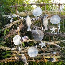 CHF 2,65Der Eyecatcher an diesem maritimen Dekohänger aus Seegrasfasern ist die große Capiz-Muschel in Violett. Oben wird sie flankiert von einer kleinen Herzmuschel und unten von einem kleinen Treibholz. Das wiederum schließt mit seinem Pendant eine weitere Herzmuschel ein, woran sich schließlich ein Seestern anschließt, der die Hängedeko abschließt. Auf gut 28 Zentimeter sind die Elemente verteilt. Durch...