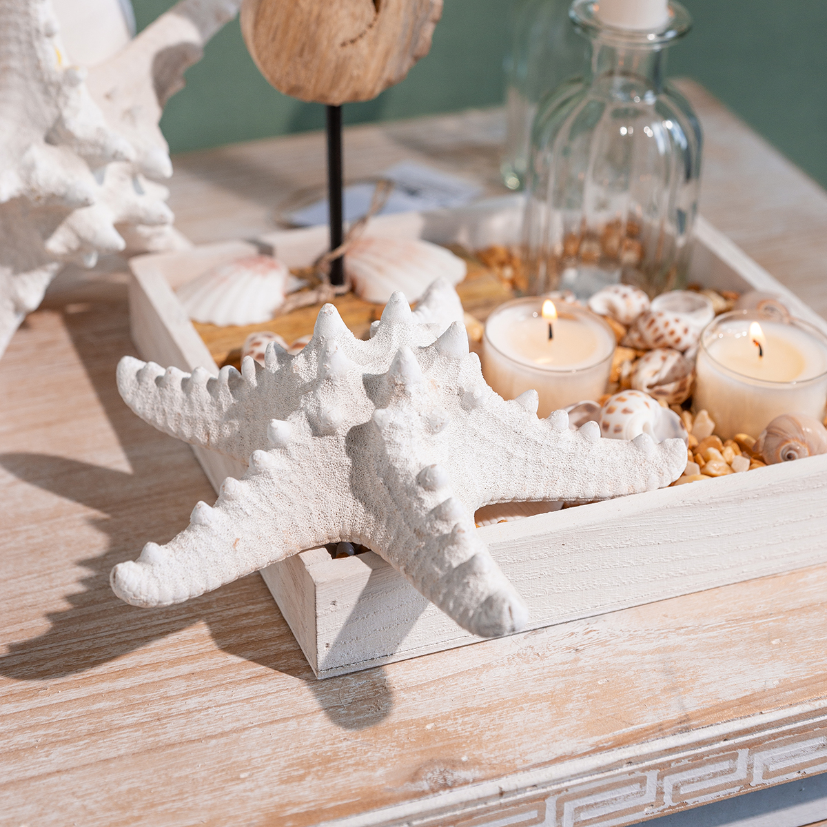 Come decorazione, queste stelle marine sono le grandi stelle del mondo sottomarino. Le stelle marine nubbed sono state essiccate e sbiancate e sono quindi di colore bianco. I prodotti naturali sono disponibili in confezioni da dieci in dimensioni e forme leggermente diverse. Tipici per i corpi degli animali sottomarini sono le cinque braccia leggermente ricurve con delle manopole. Nel mezzo degli echinodermi, la forma a stella converge in una specie di corona.Composizioni vegetali e vasi di fiori possono essere decorati con queste vere stelle marine. Insieme a conchiglie e legni, le stelle marine sono gli elementi più popolari per le decorazioni marittime. Come decorazioni da tavola per feste come compleanni o feste in spiaggia, fanno praticamente parte dell'attrezzatura di base. Una decorazione da appendere marittima può essere realizzata con una corda di iuta, che puoi usare sia come ghirlanda che come campanello a vento. Le stelle marine nodose sono una scelta eccellente per un suggestivo mondo sottomarino di decorazione.