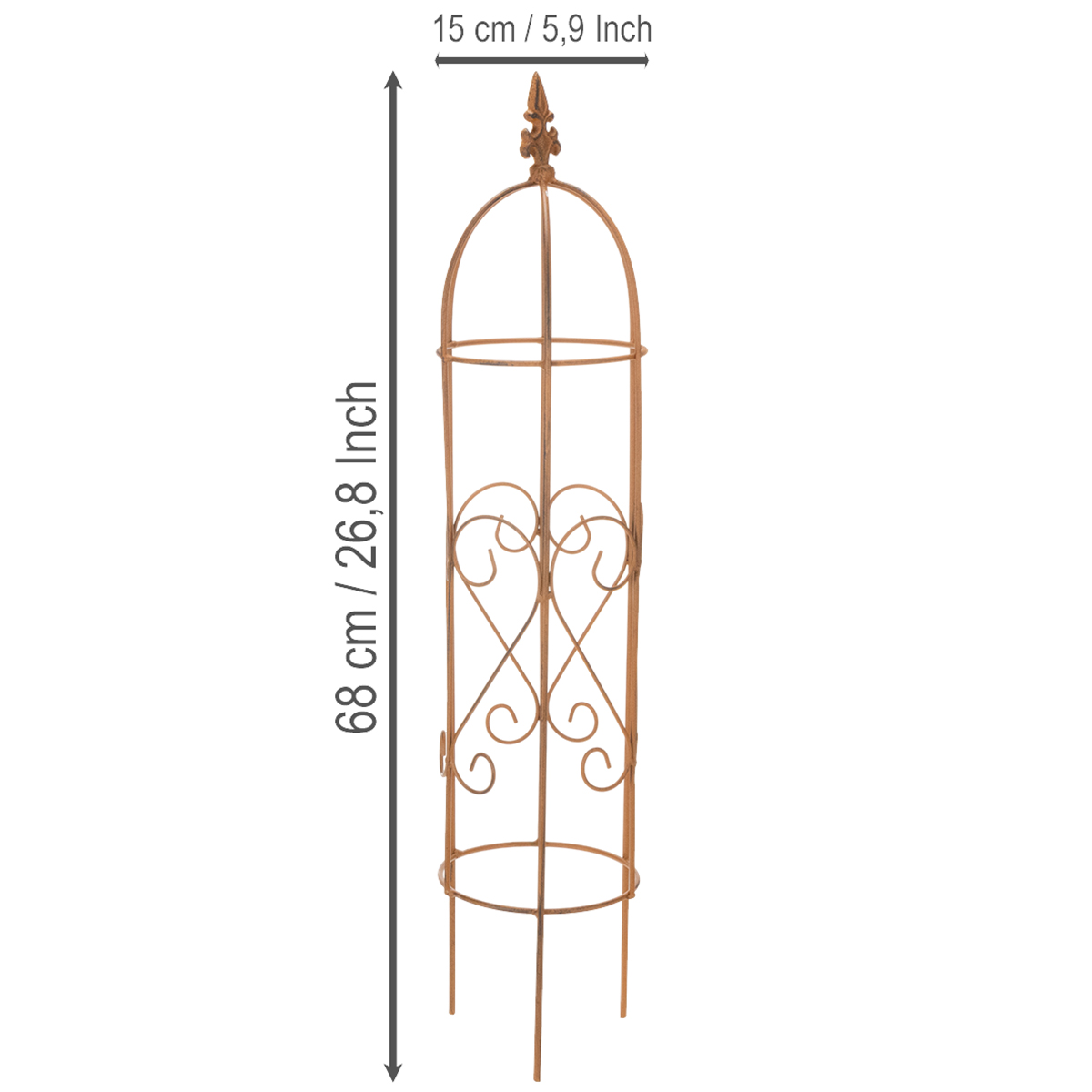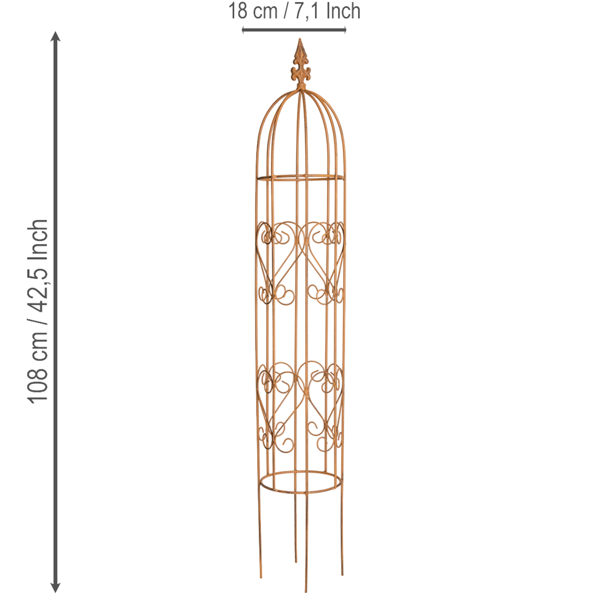 Verleihen Sie Ihrem Garten eine unverwechselbare Eleganz mit dieser exquisiten Rankhilfe aus Metall. Mit einer Höhe von 108 Zentimetern beziehungsweise 68 Zentimetern bieten die Rankgitter für den Garten nicht nur optimalen Halt für Ihre Kletterpflanzen, sondern werden dank des zeitlosen Designs auch zu einem dekorativen Highlight in jedem Außenbereich. Egal ob Rosen, blühende Rankblumen oder Reben – dieses Rankgerüst aus Metall unterstützt das Wachstum Ihrer Pflanzen und sorgt gleichzeitig für eine stimmige Gartengestaltung. Die aufwändig im Edelrost-Look gestaltetete braune Beschichtung schützt die Rankhilfe vor Witterungseinflüssen, sodass Sie lange Freude daran haben. Bringen Sie mit dem Obelisken für Rankenpflanzen Struktur und Lebendigkeit in Ihren Garten!