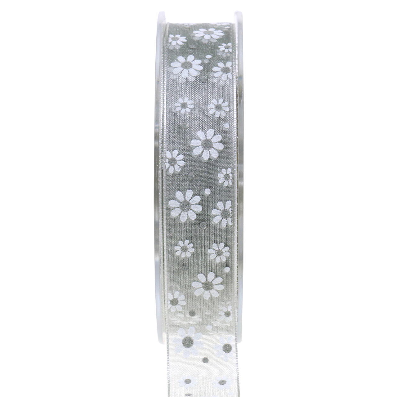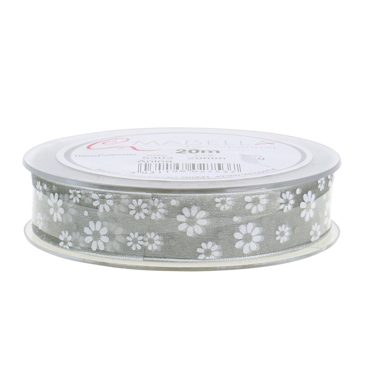Das graue Organzaband mit dem weißen Blumenmuster erhalten Sie auf einer Rolle aus