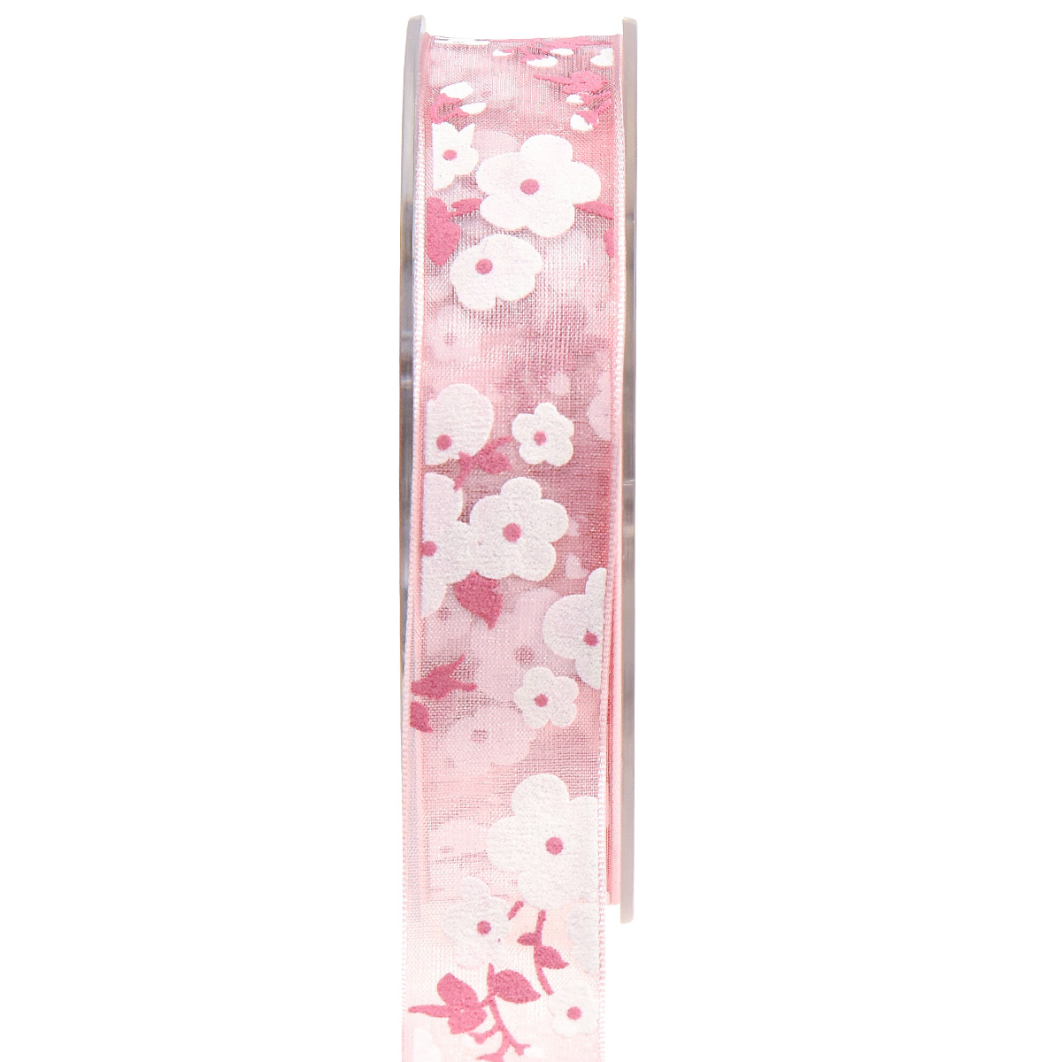 Produktname: Organzaband Rosa mit Blumen Geschenkband 20mm 20m