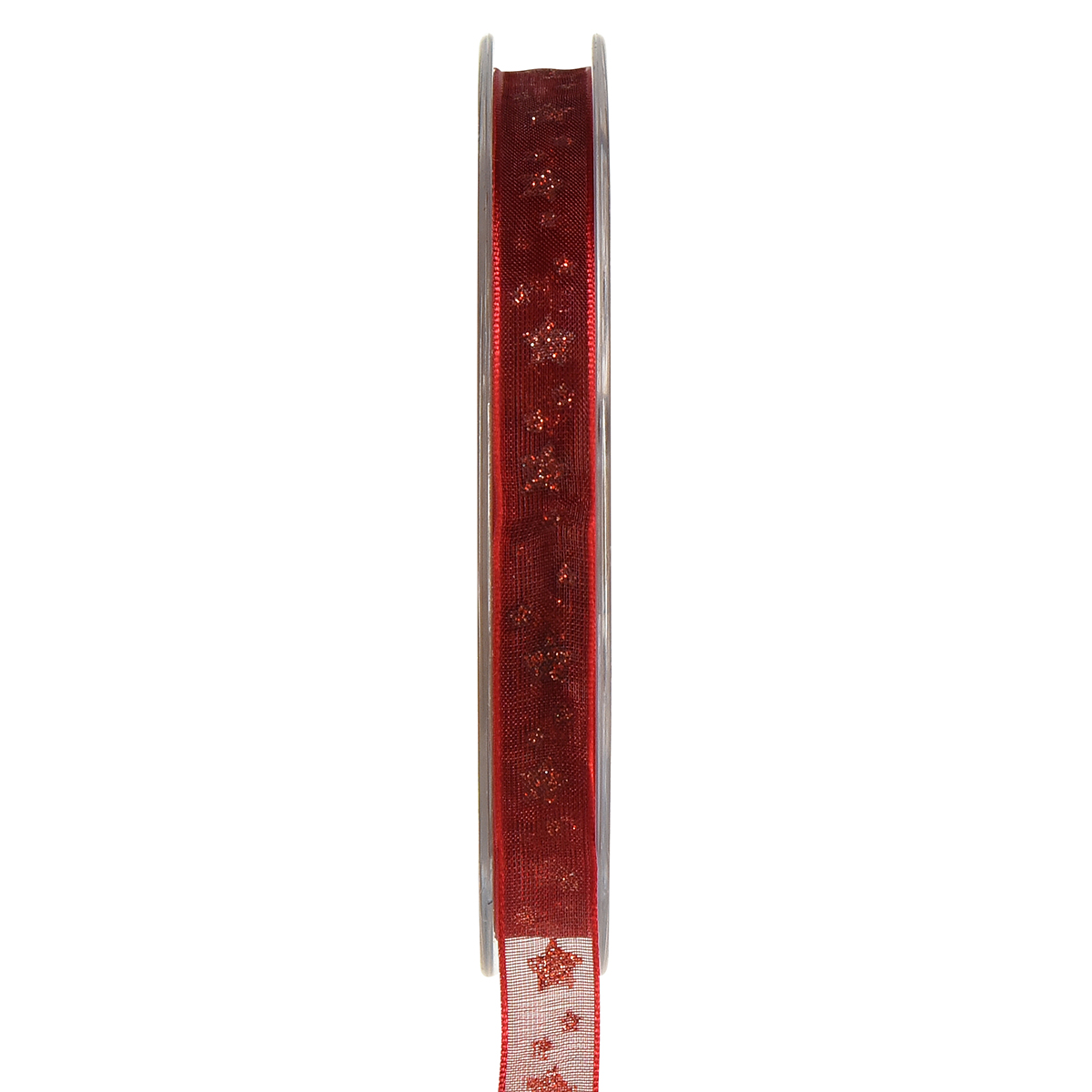 Produktname: Organzaband Rot mit funkelnden Sternen – Weihnachtsband 10mm 20m