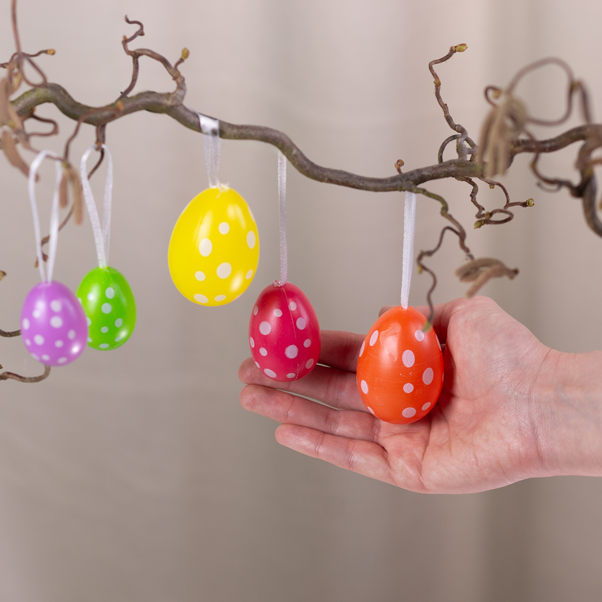 Diese bunten Ostereier zum Hängen sind das perfekte Accessoire für Ihre Osterdekoration. Im Set enthalten sind 12 Eier, die aus Kunststoff gefertigt sind und damit langlebig und kinderleicht zu platzieren. Die Farben Gelb, Blau, Grün, Orange, Rosa und Lila sowie weiße Punkte sorgen für einen lebendigen und verspielten Look. Das große Ei ist etwa 6 cm hoch – eine ideale Größe, die an Zweigen, in Gestecken oder am Osterbaum optimal zur Geltung kommt.