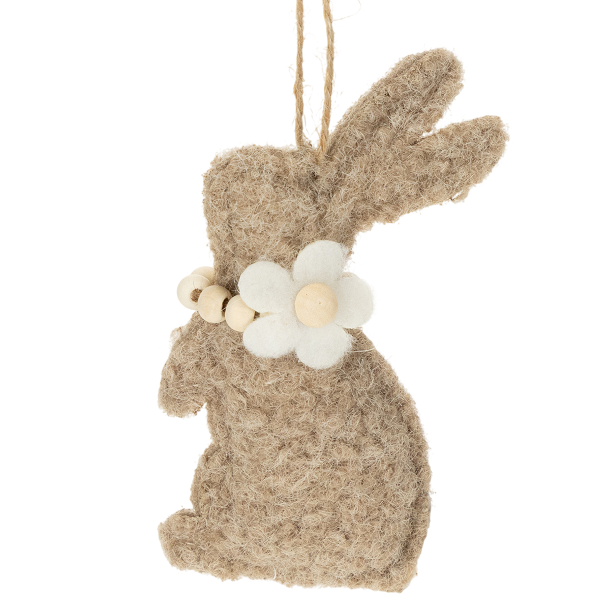 Cette décoration de Pâques en feutrine de haute qualité, représentant un lapin suspendu, est à la fois décorative et d'une grande polyvalence. Chaque lapin est orné de détails délicats, comme une fleur en filigrane autour du cou. Ses tons beige et crème naturels s'harmonisent parfaitement avec d'autres éléments décoratifs, des œufs de Pâques colorés à la verdure fraîche.