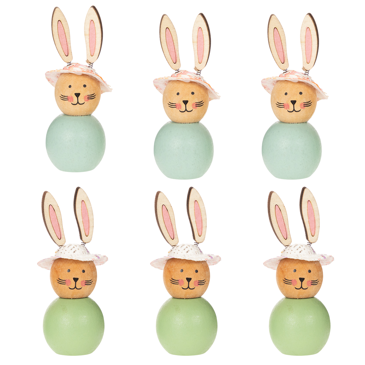 Ces figurines en bois séduisent par leur charme naturel et leur gaieté : le bois clair, associé à de subtiles nuances de vert et de menthe, se marie à un design ludique. Les chapeaux roses, en particulier, leur confèrent une élégante touche vintage. Chaque lapin mesure environ 9 cm de haut et apporte un air de printemps à votre intérieur. Les oreilles, montées sur ressorts métalliques, sont non seulement ravissantes, mais ajoutent aussi une note de fantaisie qui ne manquera pas d'attirer le regard.