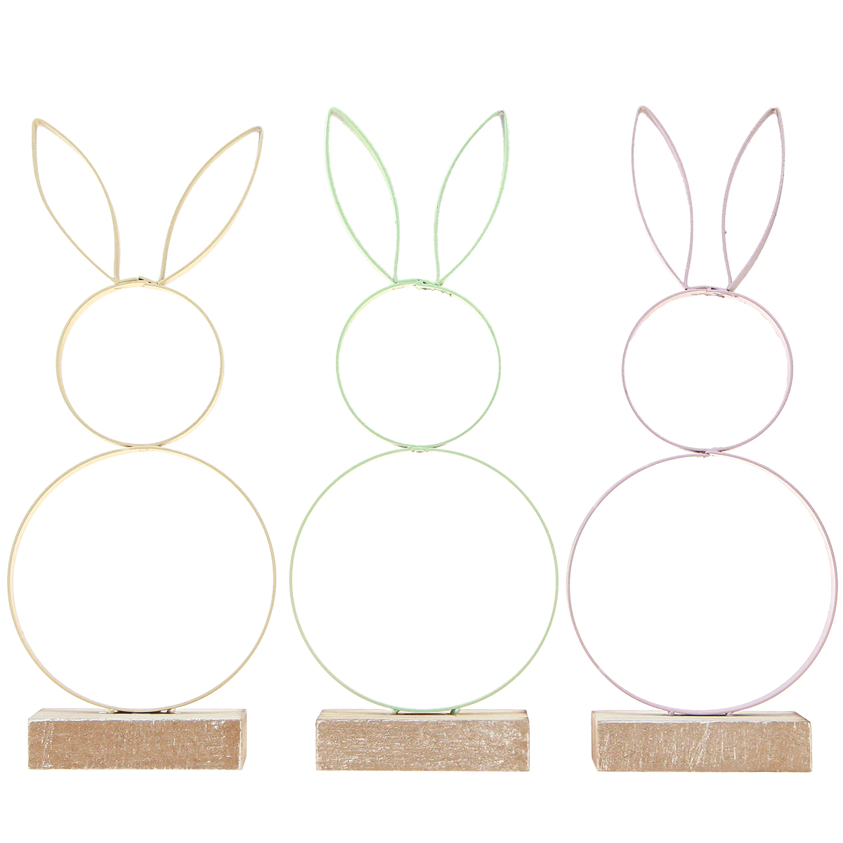 Decorazione coniglietto pasquale in metallo e legno giallo menta rosa H21cm 3 pezzi