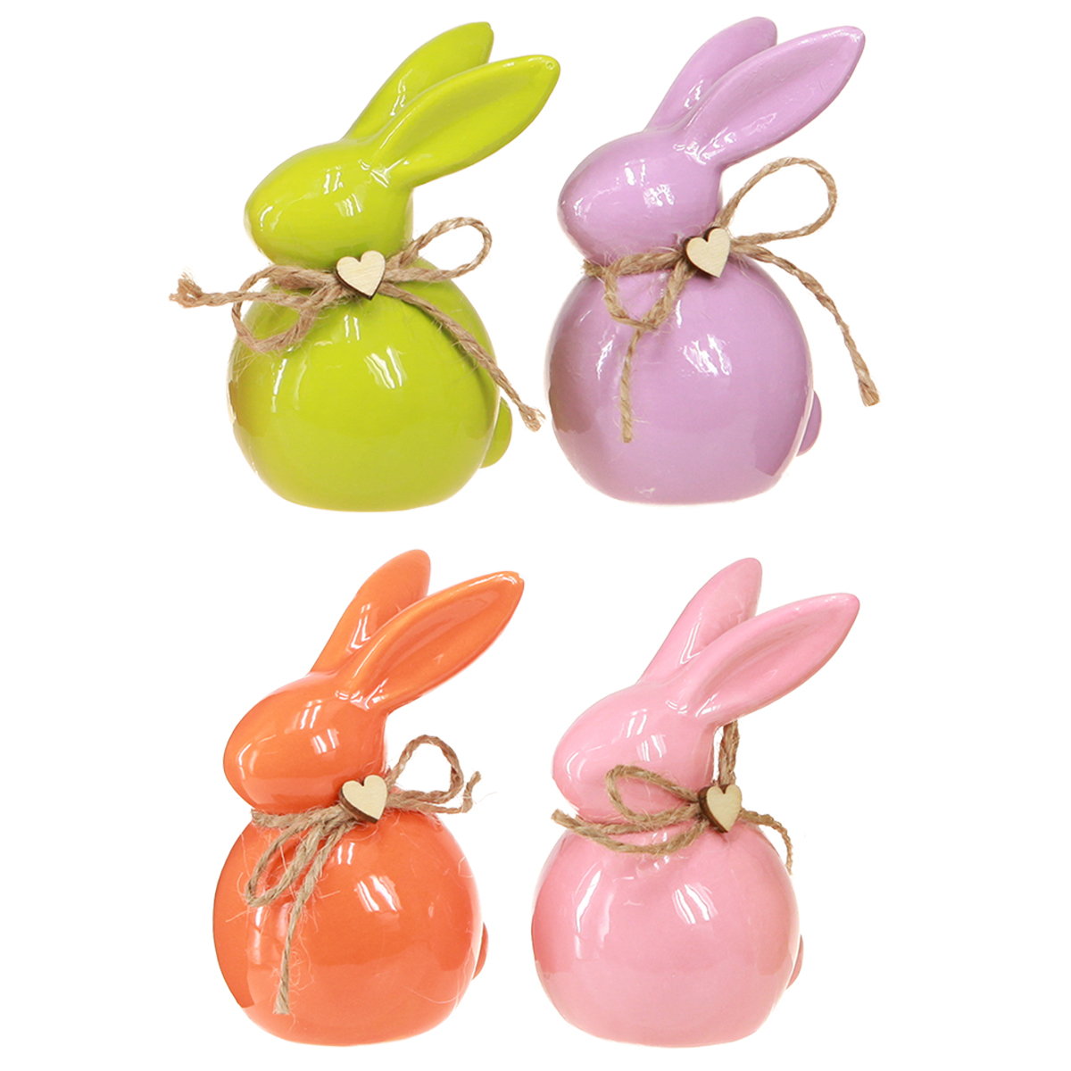 Willkommen in der Welt der Keramik-Osterhasen-Deko, die nicht nur Ihre Ostertage verschönert, sondern auch das Gefühl von Frühling in Ihr Zuhause bringt. Unsere bunten Osterschmuck-Hasen präsentieren sich in vier Trendfarben, die perfekt zum Frühlingsbeginn passen: frisches Grün, zartes Rosa, lebhaftes Orange und elegantes Violett. Diese niedlichen, sitzenden Häschen wurden liebevoll aus Keramik gefertigt und mit feinen Details wie einer Juteschleife samt kleinem Holzherz versehen. Sie vereinen eine moderne Formgebung mit traditionellem Charme, was sie zu einer perfekten Frühlingskranz-Dekoration oder einem Highlight auf jeder Fensterbank macht.
