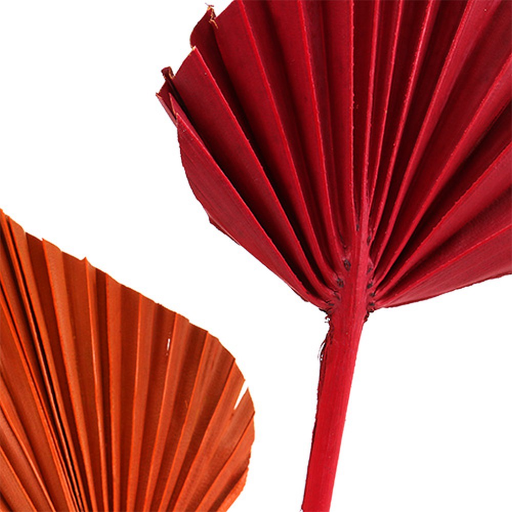 Donnez du cachet à vos compositions funéraires de la Toussaint avec ces mini feuilles de palmier en rouge et orange! Cette feuille de palmier naturelle a été soigneusement séchée, teintée puis découpée en forme de pointe de lance. En outre, elle a conservé une grande partie de sa tige qui pourra être incorporée facilement dans les diverses décorations. Vous pourrez donc fixer le palm spear dans de la mousse florale, mais également utiliser la tige pour y attacher plus des fleurs séchées, des plantes exotiques et divers proteas.Il vous sera possible de réaliser une grande variété de décorations de deuil comme un arrangement de table pour le service commémoratif, un devant de tombe pour la Toussaint ainsi qu'un bouquet du souvenir pour un anniversaire ou toute autre occasion. Pour adapter la feuille à la taille de votre création, vous pouvez raccourcir sa tige ou tout simplement la couper pour n’utiliser que la tête.