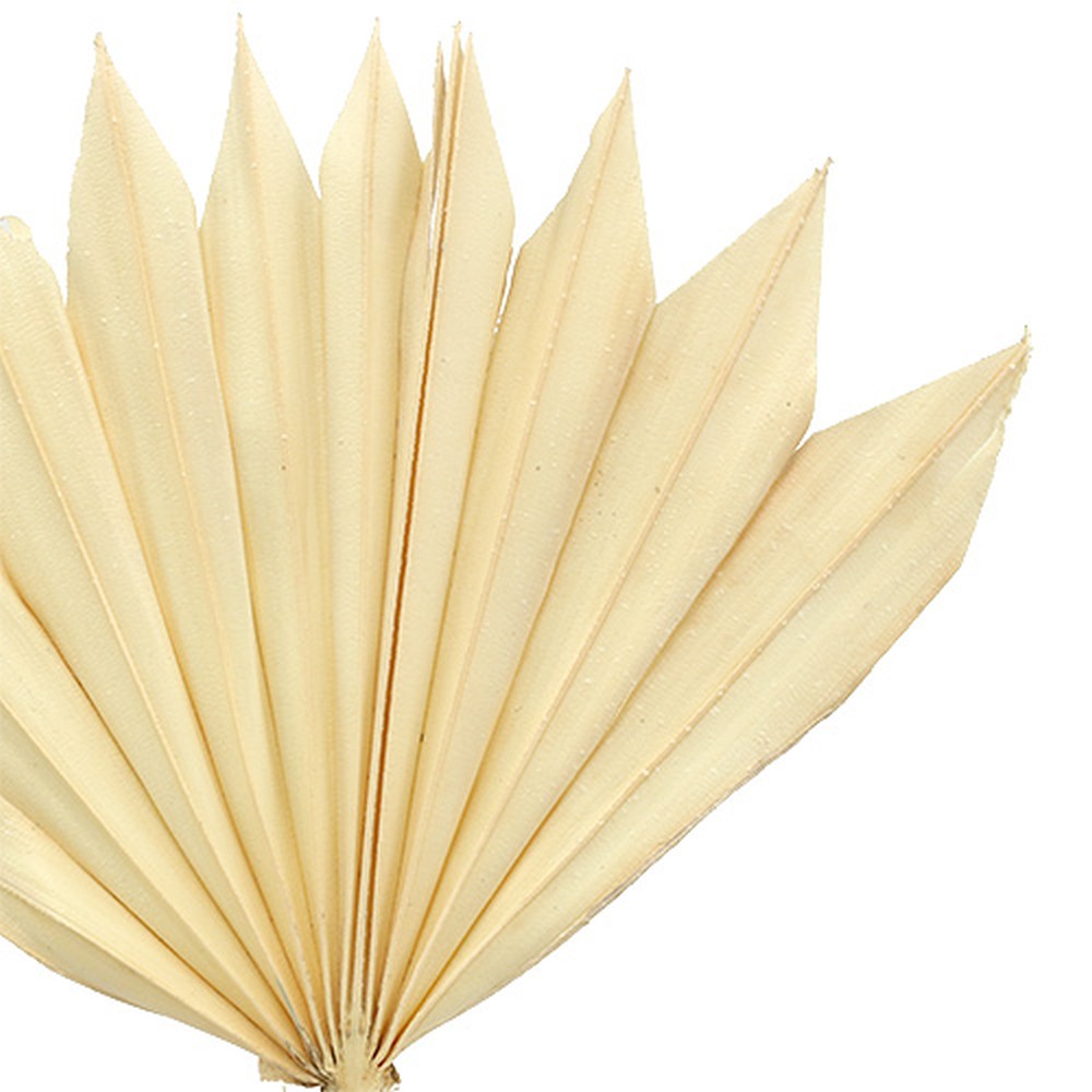 Cette mini feuille de palmier décolorée est un article naturel très précieux qui vous permettra de donner beaucoup de cachet à un ornement funéraire. Séchées et blanchies, ces feuilles exotiques ont été coupées et pliées en forme d’éventail et font penser à un soleil levant, une image qui a une forte symbolique dans les arrangements et les couronnes de deuil. Pourvues d’une longue et robuste tige, elles s’insèrent aisément dans de la terre ou de la mousse florale.Pour élargir le champs des possibilités, n’hésitez pas à couper voire à retirer entièrement la tige pour garnir avec les seules feuilles la base de vote composition ou d’un bouquet. Et bien sûr, ces palm spear comme on les nomme aussi feront des merveilles au sein d’un ensemble fait d’autres plantes exotiques comme des coques Bell Cup, des noix de bouddha et des tiges de rotin ondulées. Les proteas et les les fleurs séchées de nos régions figurent parmi les nombreux autres articles qui avec leurs couleurs naturelles se marient très bien avec les feuilles de palmier.