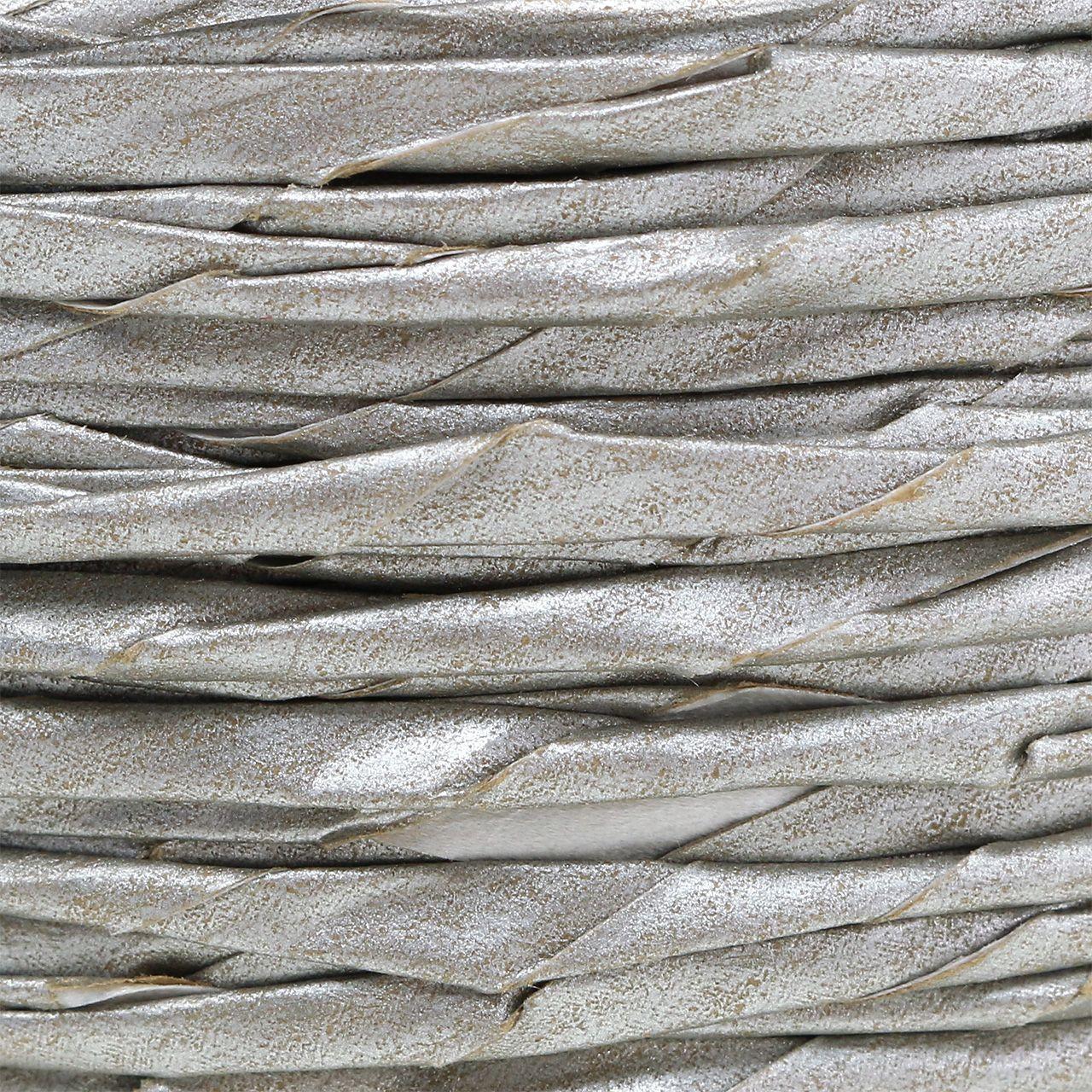 Ce cordon de papier torsadé argenté sans fil de fer servira aussi bien de ruban d’emballage insolite que d’accessoire de bricolage et de décoration très polyvalent ! Que ce soit dans le domaine privé entre amateurs ou dans le milieu professionnel de l’art floral, c’est une ravissante cordelette qui va donner une petite touche très décorative à vos créations ! Vous vous en servirez tout au long de l’année pour finaliser vos paquets cadeaux mais également pour sublimer vos arrangements de Noël et votre couronne de l’Avent ainsi que pour personnaliser les vases et les chandeliers. Il vous sera également utile pour la confection de décorations murales, par exemple à l’occasion d’un repas pour des noces d’argent. Vous en profiterez en même temps pour harmoniser l’ensemble de la décoration en apposant également des petits noeuds faits dans ce cordon sur les invitations et les chevalets de table.Notre cordon de papier torsadé argenté sans fil de fer a une longueur de près de 40 mètres et un diamètre d’environ 3 mm. Il est livré enroulé sur une bobine en plastique et se compose à 52 % de cellulose et à 48 % de polypropylène.