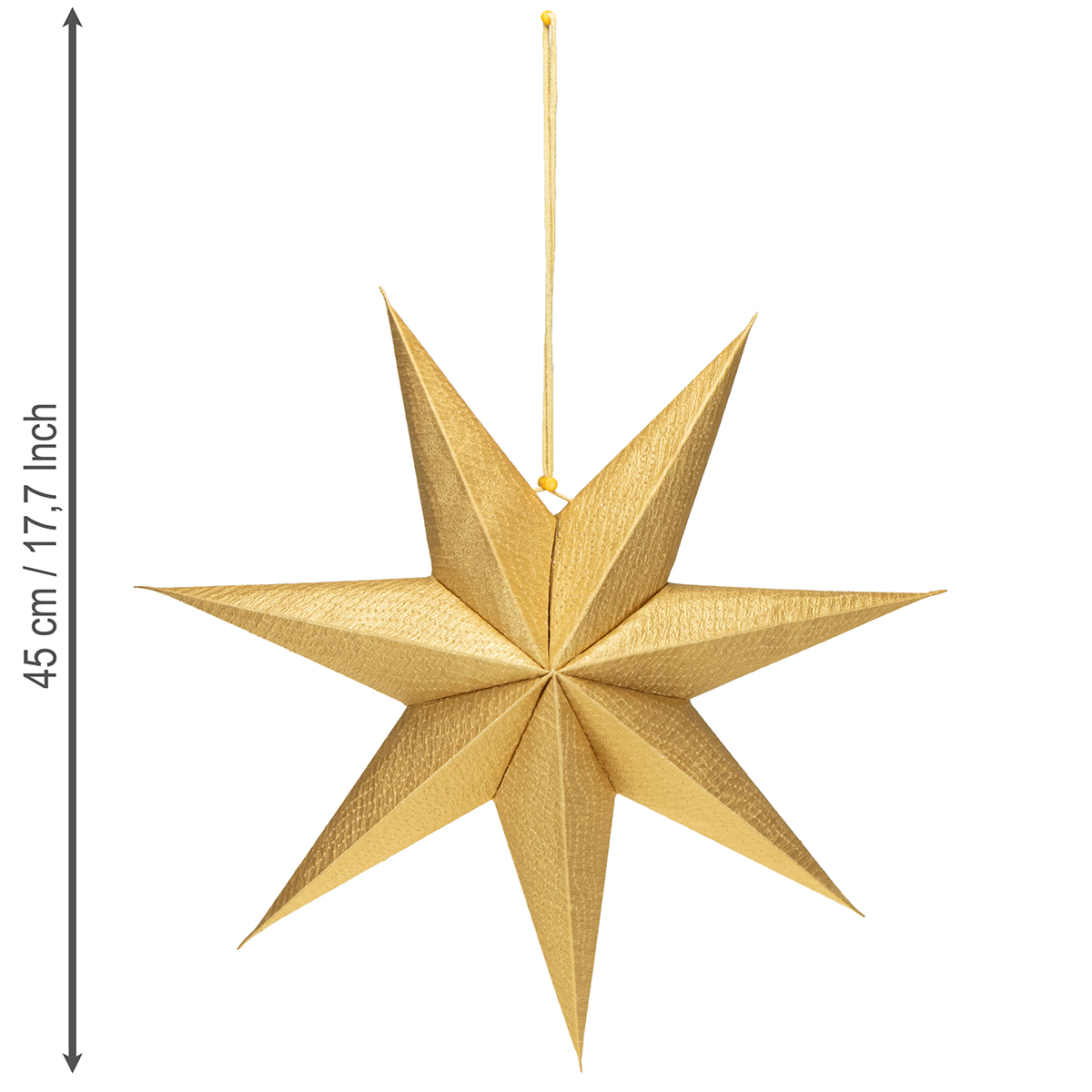 Der goldene Weihnachtsstern aus Papier ist nicht nur ein optisches Highlight, sondern auch bis ins Detail durchdacht. Mit seiner großzügigen Größe von 45 cm zieht er alle Blicke auf sich, bleibt aber trotzdem dezent und elegant. Die goldene Beschichtung schimmert wunderschön im Licht und verleiht jedem Raum eine edle Note. Kombiniert werden die Sterne mit einem praktischen Baumwollhänger inklusive Kordelstopper. Das macht das Aufhängen kinderleicht – ganz ohne komplizierte Befestigung. Dabei sind die Papiersterne für Beleuchtung geeignet. Stellen Sie sich das sanfte, warme Licht vor, das durch das goldene Papier scheint und die feinen Muster wortwörtlich ins richtige Licht rückt. Einfach zauberhaft!