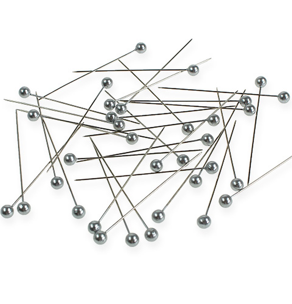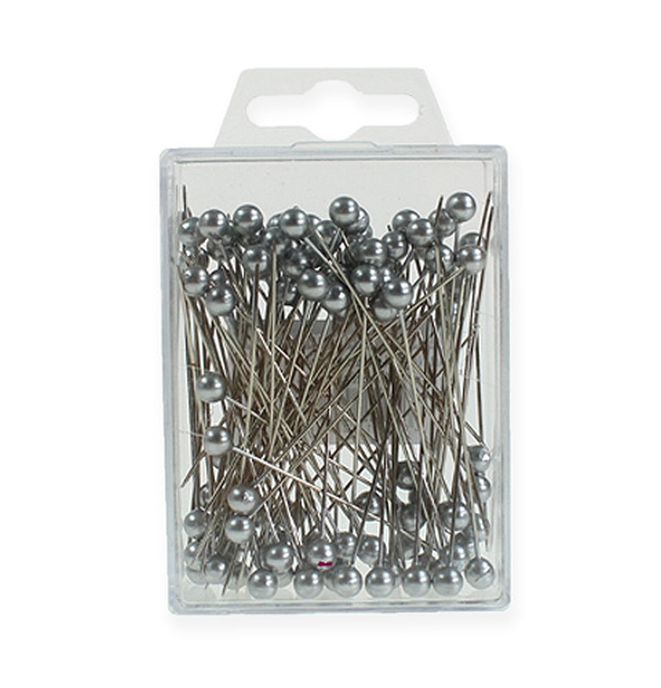 Die Perlkopfnadeln in Silber werden in einer praktischen Hängebox mit je 100 Exemplaren ausgeliefert. Eine Nadel ist etwa 65 Millimeter lang; die Perle hat einen Durchmesser von circa 6 Millimetern.