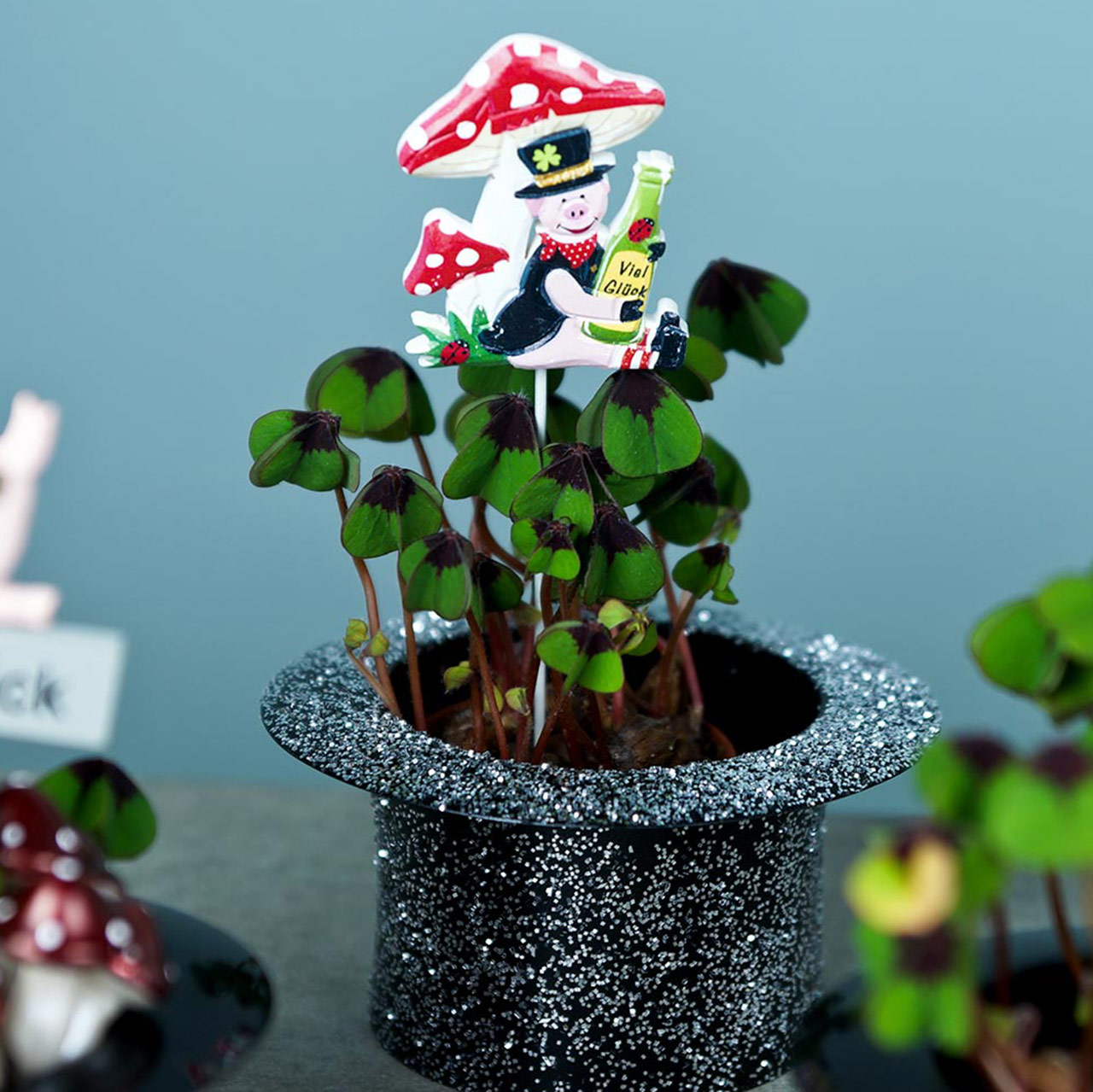 Questo allegro tappo per piante attira l'attenzione non solo nella decorazione di Capodanno. Il dolce augurio "Buona fortuna" è su una bottiglia di champagne, che viene presentata da un maiale divertente fortuna. Con una faccia buffa, il Dekotier siede sotto un agarico di mosca. Se guardi da vicino, questa spina di fiori pullula di portafortuna: il maiale, un trifoglio, una coccinella ... tutte queste cose portano un grande messaggio.