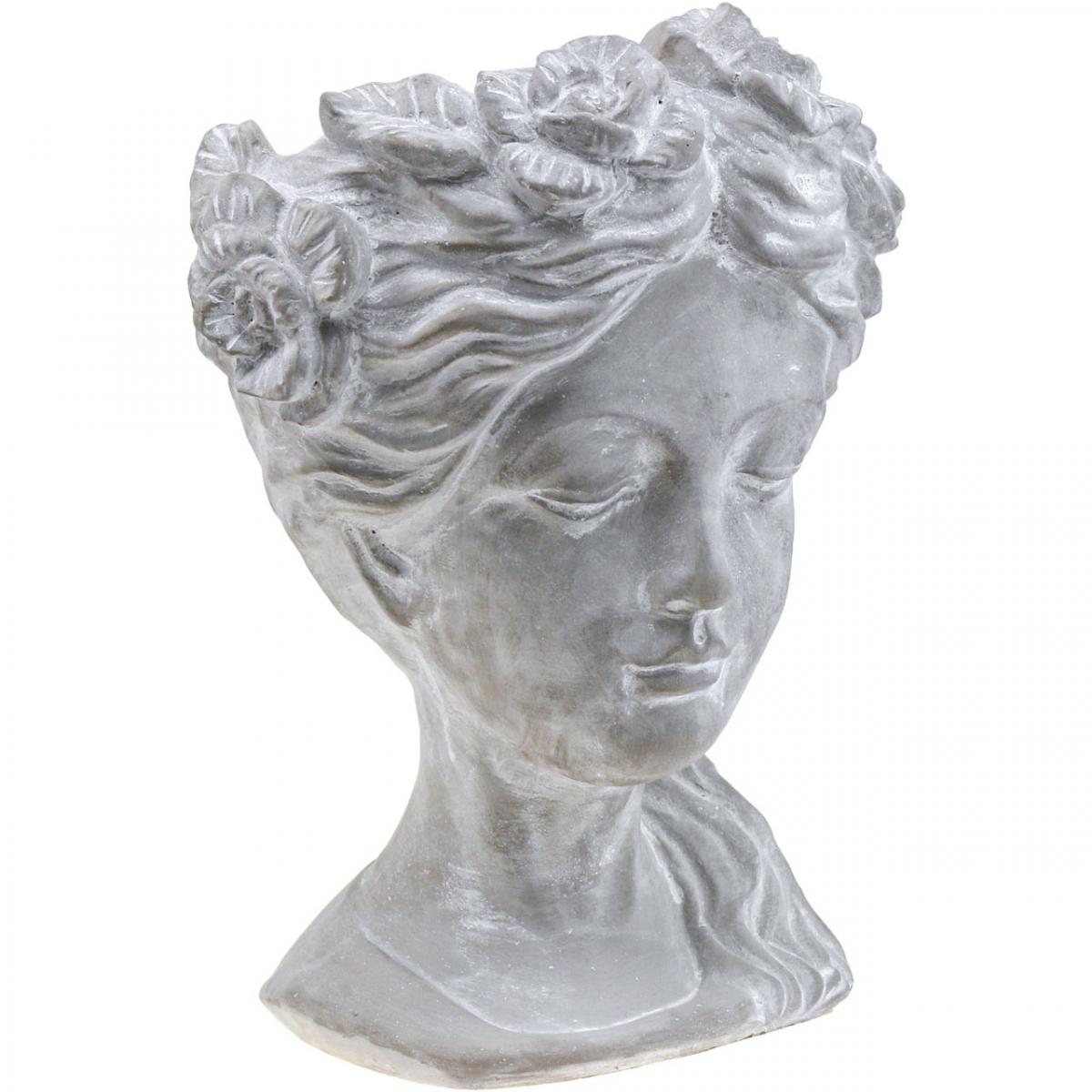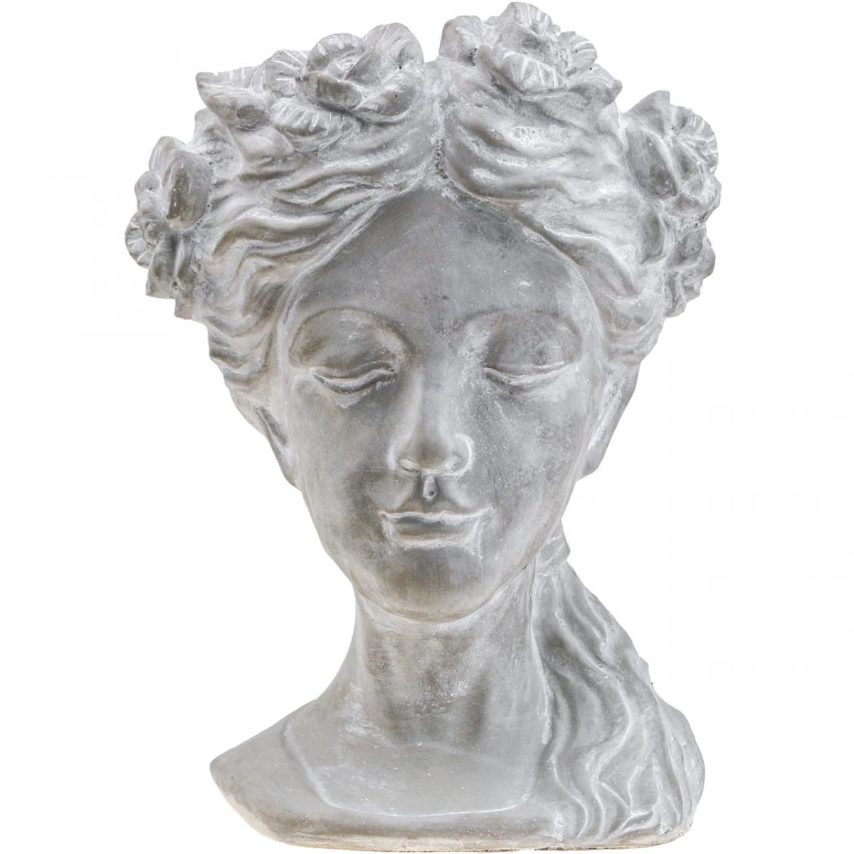 La testa della pianta celebra la bellezza femminile in una testa di donna di ispirazione antica. La fioriera in cemento è bianca lavata, il che mette in risalto magnificamente tutti i dettagli del busto.Anche senza decorazioni floreali, questa scultura incanta come decorazione! La ragazza o la giovane donna sulla fioriera ha gli occhi semichiusi, il che significa che la testa della donna irradia calma interiore. I lunghi capelli sono legati di lato e la figura porta dei fiori tra i capelli.