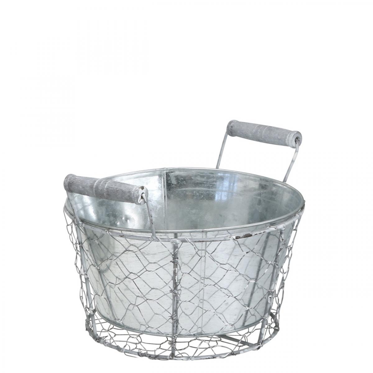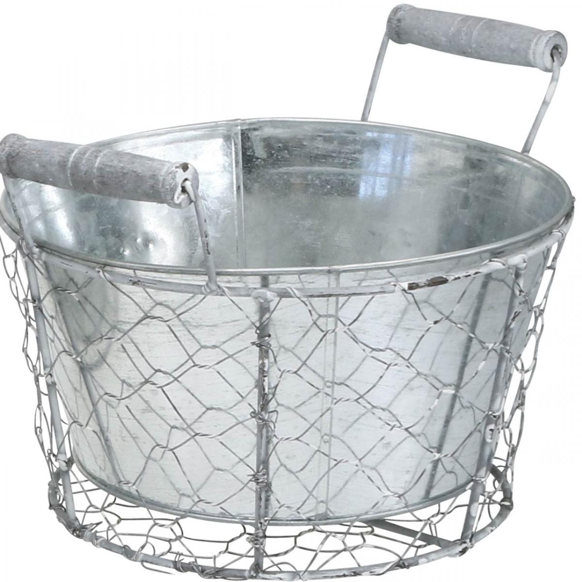 Pflanzkorb mit Einsatz, Drahtkörbchen, Pflanzgefäß Frühling Silbern, Weiß gewaschen, Shabby Chic Ø22cm H17,5cm
