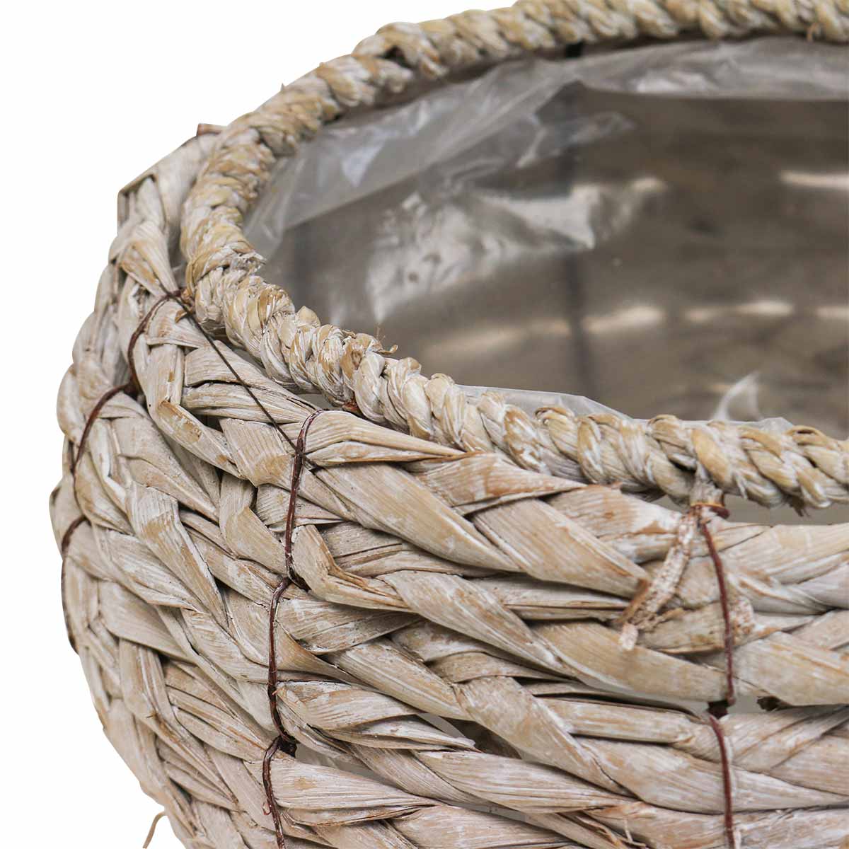 Ce panier à plantes impressionne par son charme rustique et sa surface légèrement blanchie à la chaux. Le pot de fleurs parfaitement formé est rond et bulbeux et a été habilement tressé.Le panier à plantes peut être planté immédiatement ou utilisé comme jardinière pour vos plantes en pot. Il y a un film végétal imperméable dans le panier, ce qui permet de le remplir de terreau et de l'arroser.