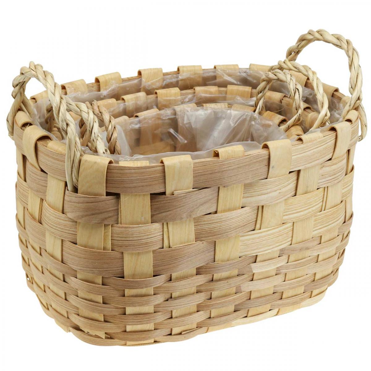 Jeder Korb ist aus natürlichem Holzspan in verschiedenen Größen und wirkt deshalb sehr abwechslungsreich. Der Boden des Pflanzkorbs besteht aus einer dünnen Holzplatte. Innen ist das Pflanzgefäß mit Kunststoff-Folie ausgekleidet. So nimmt das Holz beim Gießen keinen Schaden.