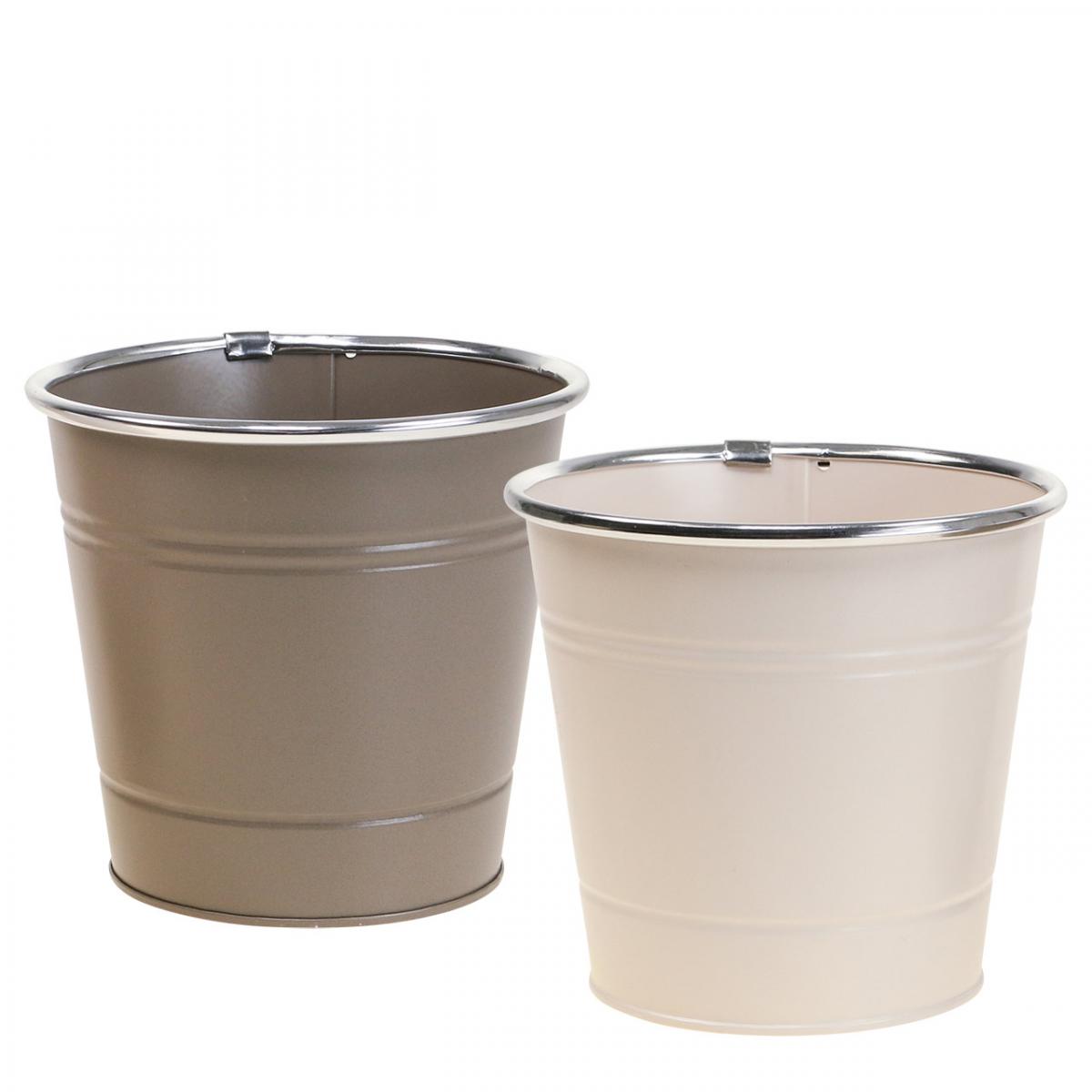 Die zwei Pflanzkübel sehen aus wie kleine Metalleimer mit den typischen dekorativen Ringen und einem silbern glänzenden Rand. Der eine Blumentopf ist in Braun und der andere in Creme gefärbt.