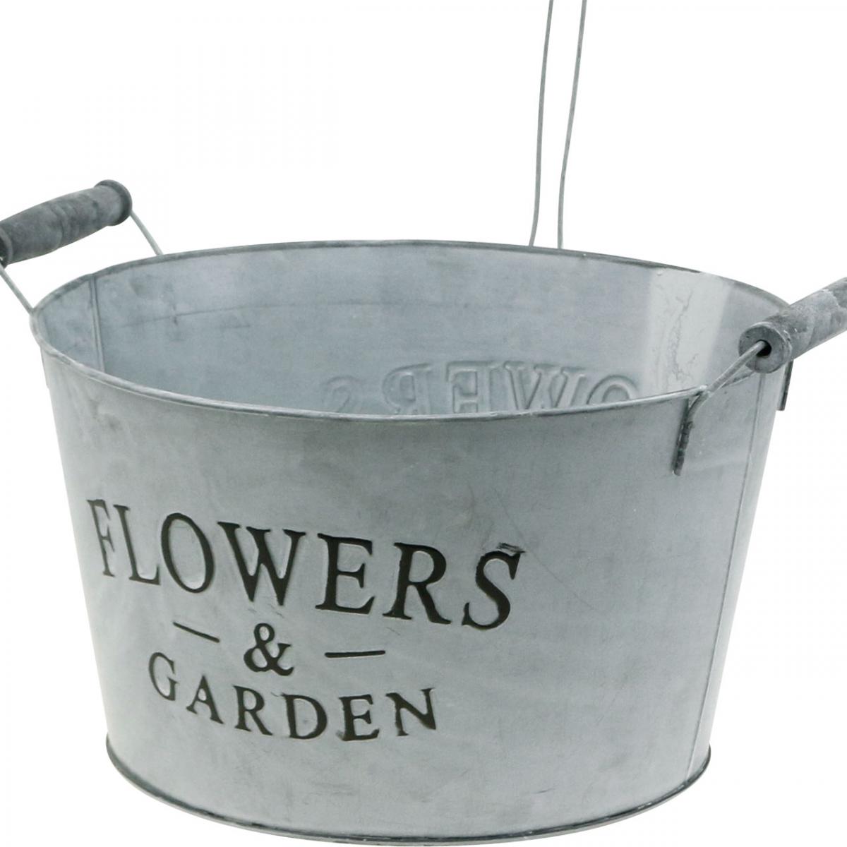 Das große Metallgefäß zum Bepflanzen hat zwei Henkel mit Holzgriffen und zwei gebogene Metallstangen lassen eine kleine Deko-Gießkanne über der Metallschale schweben. So sieht es aus, als würde die Kanne aus Metall gerade die Blumendeko im Pflanzgefäß gießen.