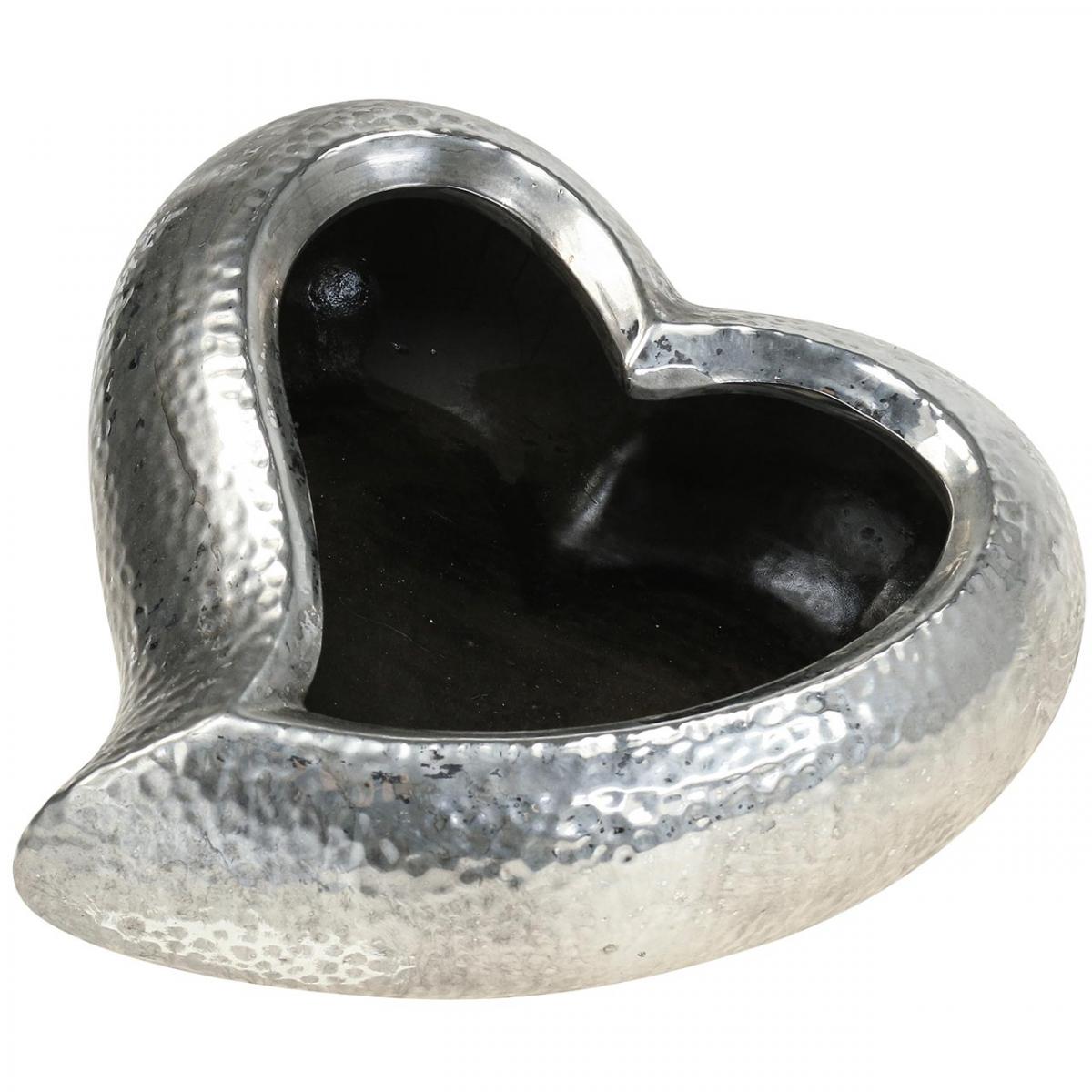 Ce bol à plantes en forme de cœur en argent est une façon très élégante de placer des fleurs en pot dans une belle jardinière. Le cœur en céramique à planter peut également être rempli de terre et planté directement comme bac à fleurs. - Ou vous pouvez utiliser le beau cœur de plante comme base noble pour des compositions florales sincères, par exemple comme décoration de table noble pour un mariage ou comme cœur de décoration funéraire digne.La jardinière mesure environ 24 centimètres de large et 10 centimètres de haut. À l'extérieur, le magnifique bol à fleurs déco cœur est émaillé en argent brillant et a une surface qui ressemble à une décoration en métal martelé.