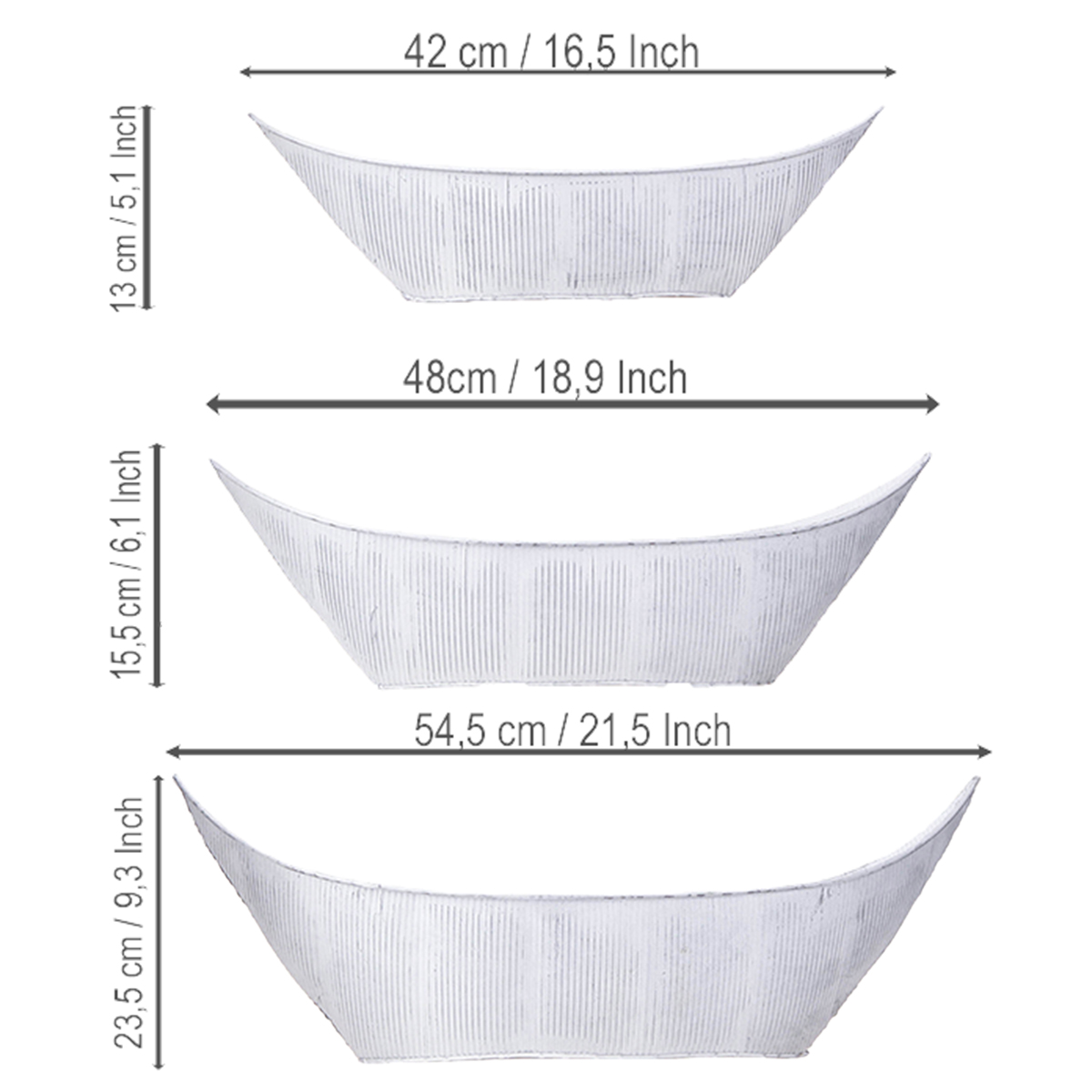 Vaso per piante a forma di barca, in metallo, bianco/argento, 54,5/48/42 cm, set da 3