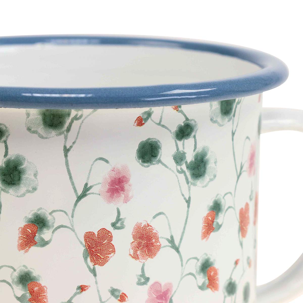 Puoi presentare le tue piante preferite o idee decorative in questa fioriera. La tazza smaltata con i divertenti motivi floreali ha molto fascino vintage.La tazza decorativa bianca ha un bordo blu e una spruzzata di vernice blu sul manico. La coppa è decorata tutt'intorno con un motivo di steli di fiori verdi e fiori rossi e rosa.