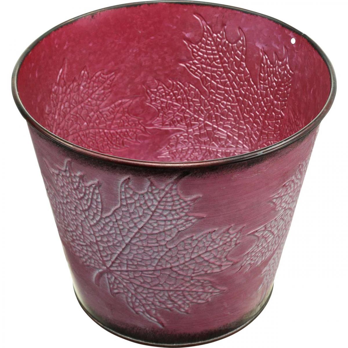 Cache-pot à décor de feuilles, décoration d'automne, jardinière en métal rouge vin Ø16,5 cm H14,5 cm