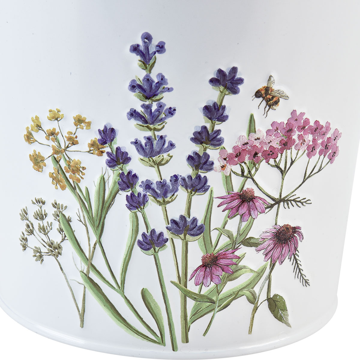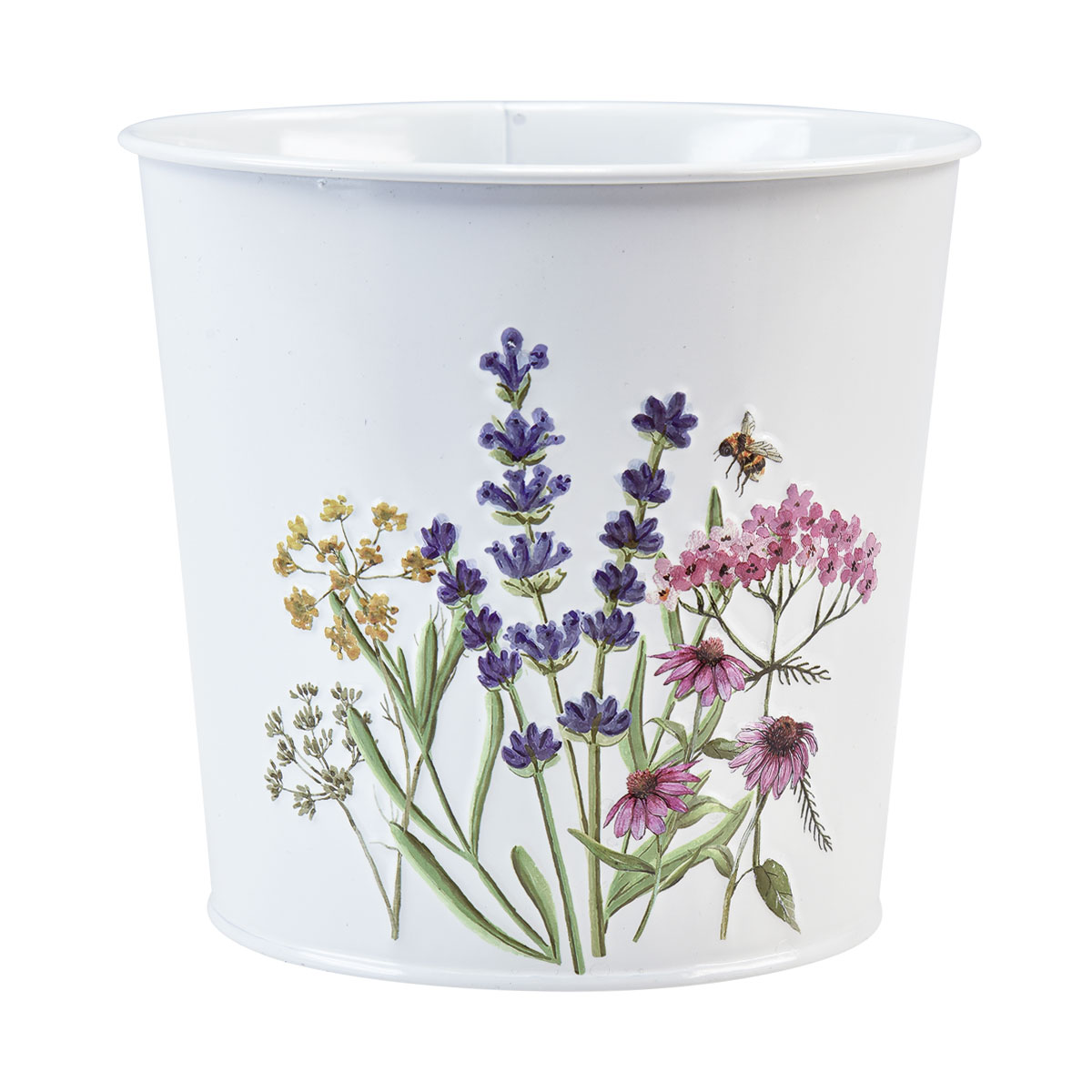 Ce magnifique pot de fleur en métal est parfait comme pot de fleurs pour vos décorations printanières ou estivales ! La jardinière simple en métal blanc est décorée sur un côté d'un motif en relief d'herbes sauvages avec une abeille, colorée dans des couleurs naturelles.Le gaufrage d'aneth fleuri, de lavande, d'origan, d'échinacée et d'abeilles vous invite à planter le pot de fleur en métal. Mais les compositions ou les plantes en pot sont également magnifiques dans le pot rond en zinc !