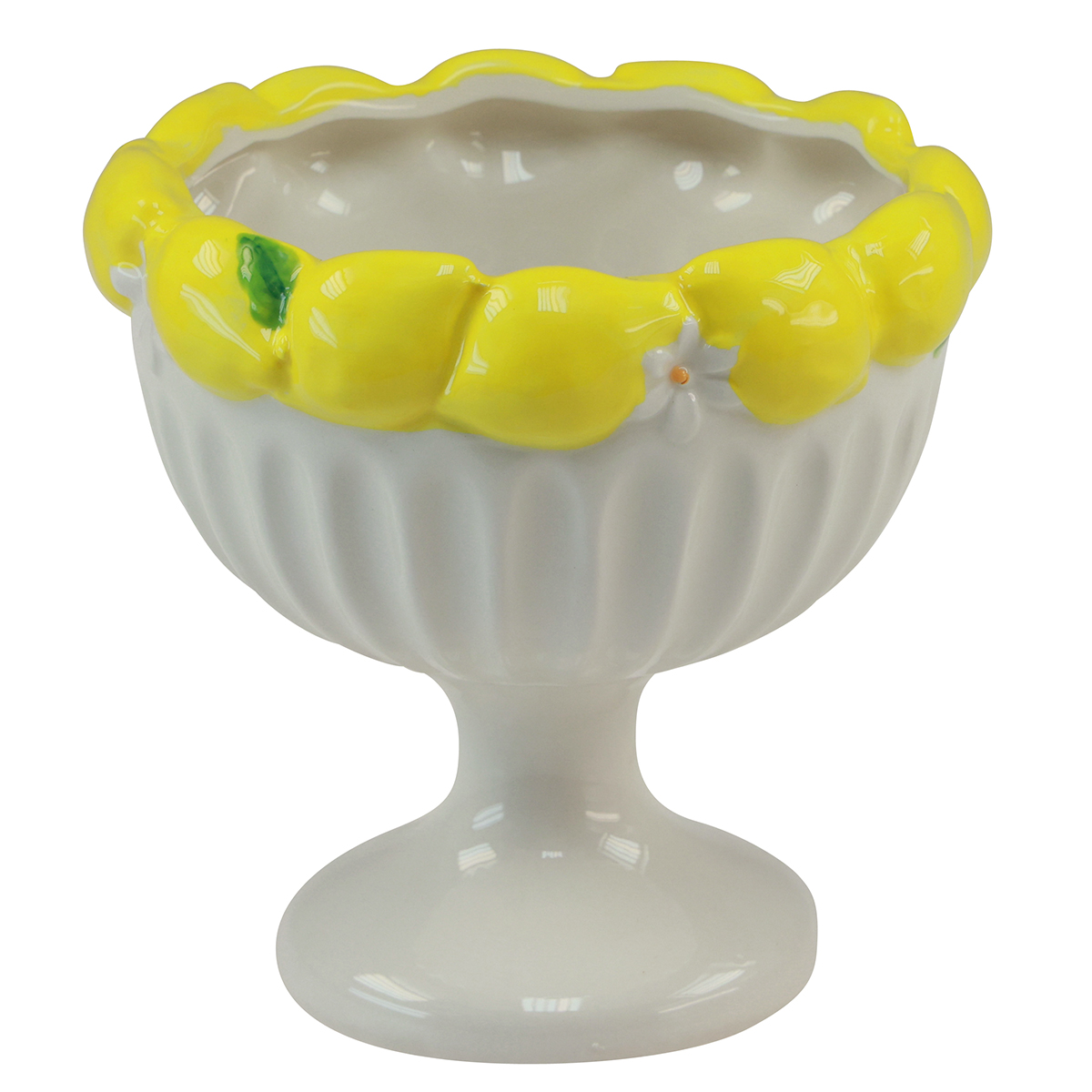 Die Schale aus Keramik ist um den Rand mit Zitronen samt Blüten und Blättern umgeben. Die Tischdeko variiert die Vorbilder mediterraner Keramik aus Süditalien als sommerlichen Eisbecher und hat einen eleganten Fuß in Cremeweiß.