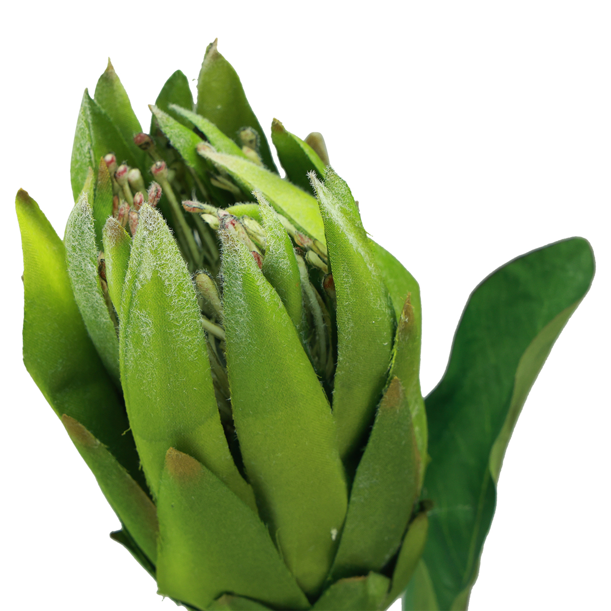 Diese Kunstpflanze ist einer jungen Protea nachempfunden. Der Kunstzweig ist grün, die Blüte ist noch leicht geschlossen. Beim genaueren Hinsehen kann man jedoch schon die weinroten Staubblätter erkennen und auch der Kelch färbt sich leicht braun.