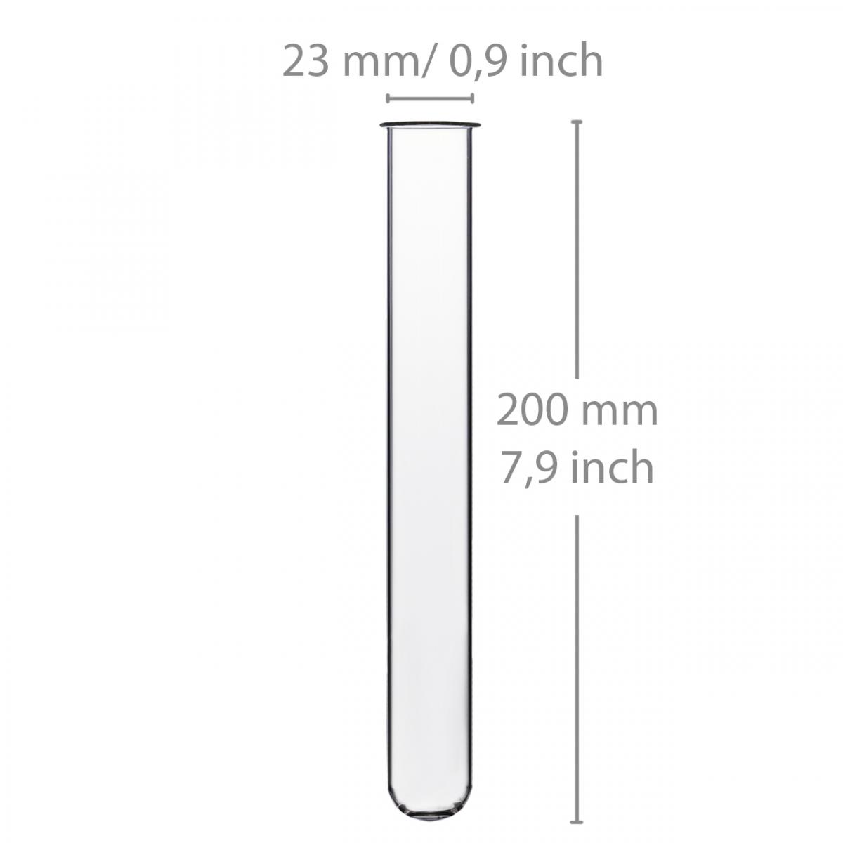 L'éprouvette est fournie avec une longueur d'environ 200 millimètres et un diamètre intérieur d'environ 22 millimètres; le bord courbé vers l'extérieur assure un diamètre extérieur d'environ 28,5 millimètres.