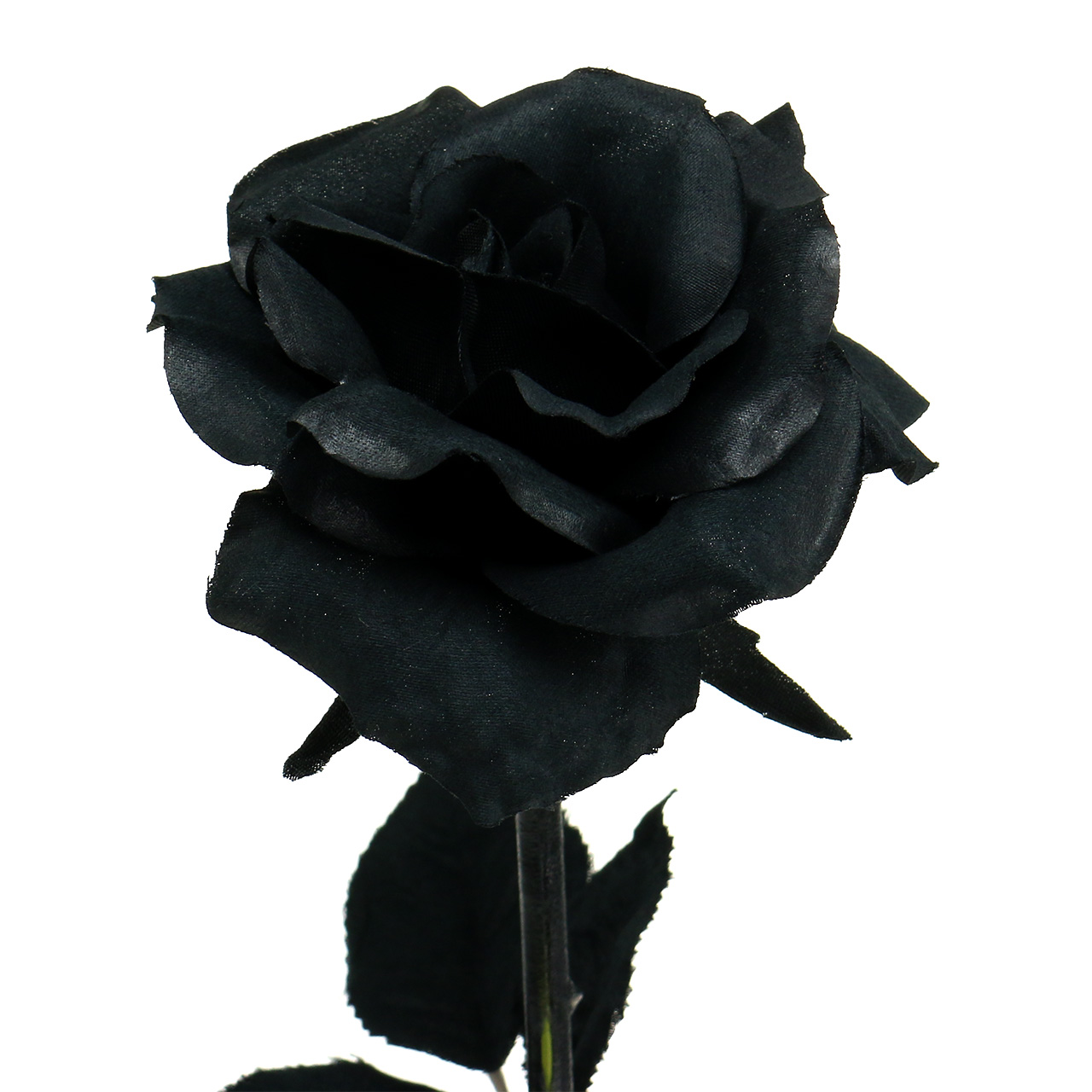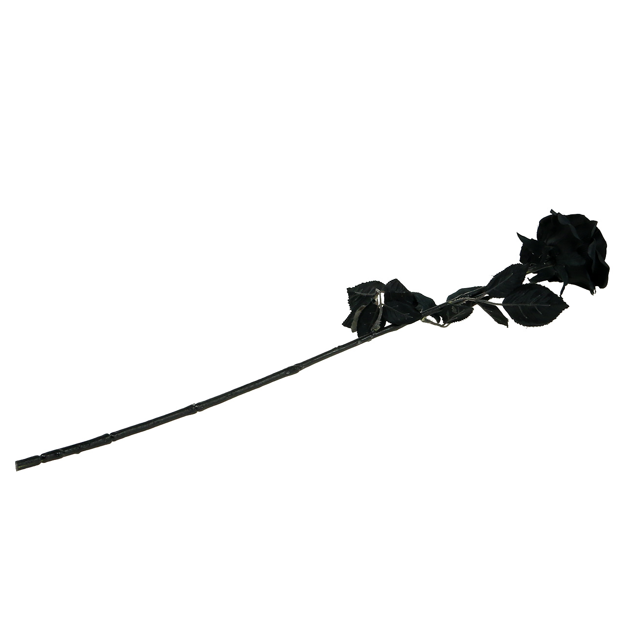 Die schwarze Deko-Rose ist ungefähr 63 Zentimeter lang. Der Blütendurchmesser der Seidenblume beträgt circa 11 Zentimeter.